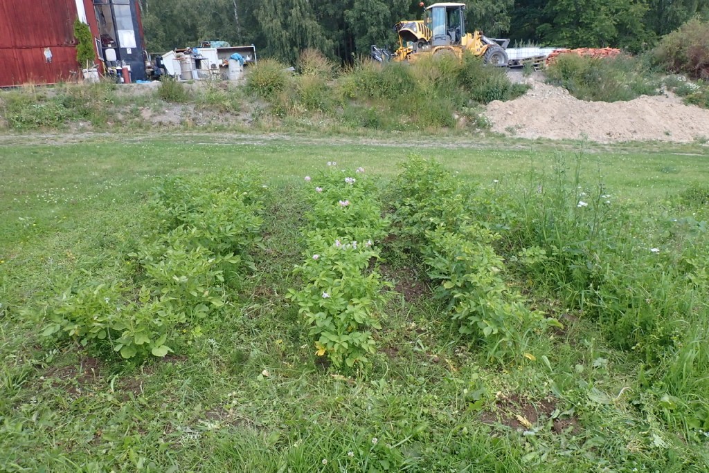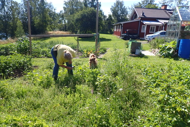 En efter en av hundarna gick hem. När vi kom upp för backen var det dags för tråk. M skulle rensa lite ogräs på våran del av odlingen. Vi la oss i skuggan av växthuset och vilade oss under tiden hon leker jordfräs. Av det som grävts ned i jorden har bara potatisen kommit upp.