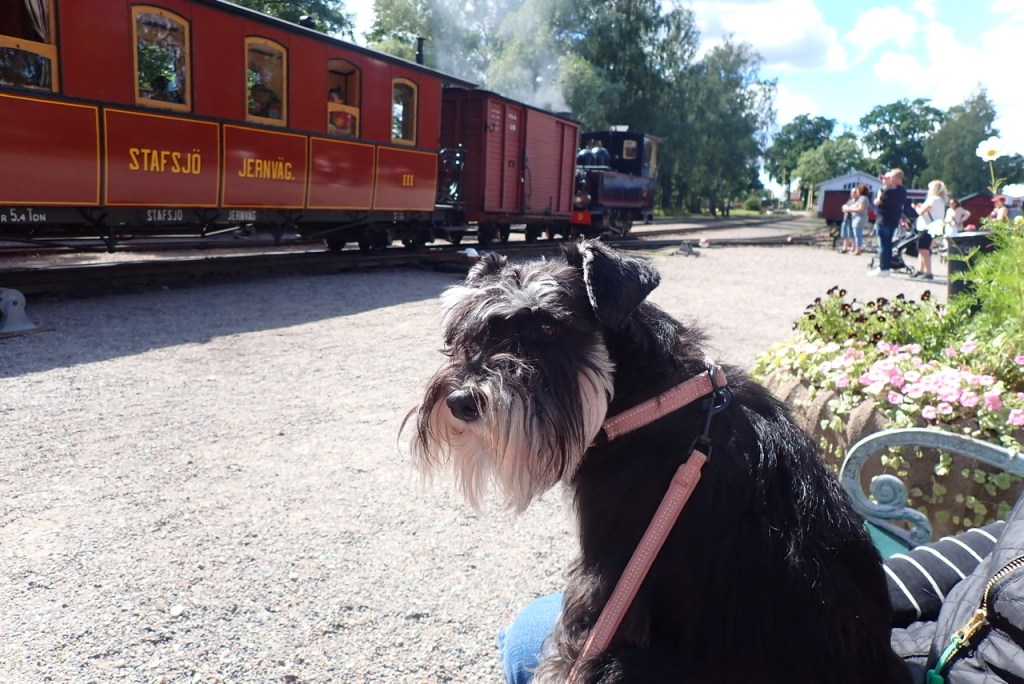 På väg tillbaka till vagnen stannade vi till i Mariefred och besökte järnvägen. Det är skönt att sitta i solen och titta på när verksamheten är i full gång. Stinsen har visat avgång, dvs vinkat med singnalstaven. När tåget lämnar stationen måste man hålla ögonen på stinsen så han inte viftar med den röda flaggan som betyder omedelbart stopp. De gör han om det upptäcks något fel på tåget t.ex en grind inte är stängd eller bromsar ligger på på någon vagn.