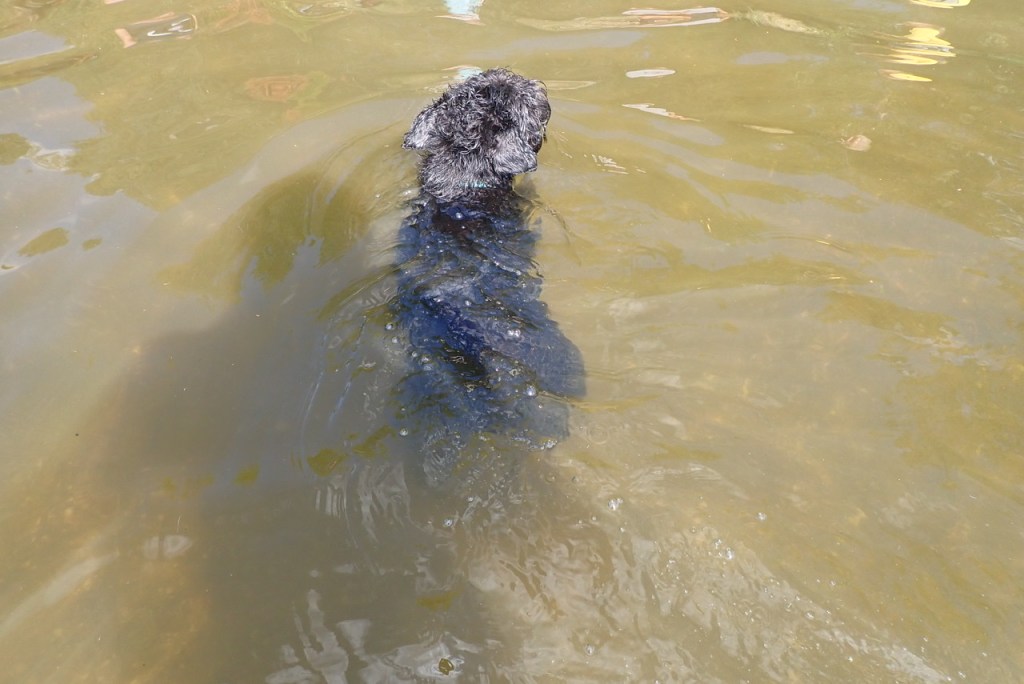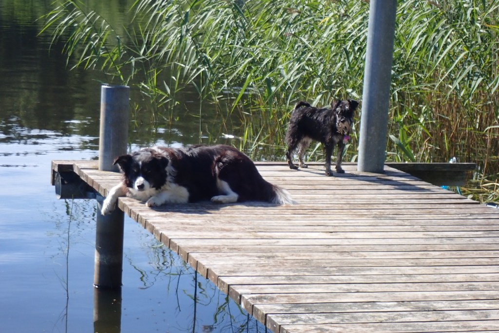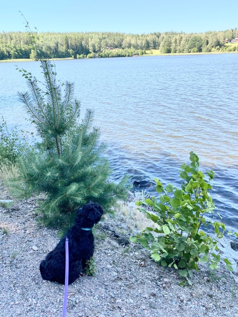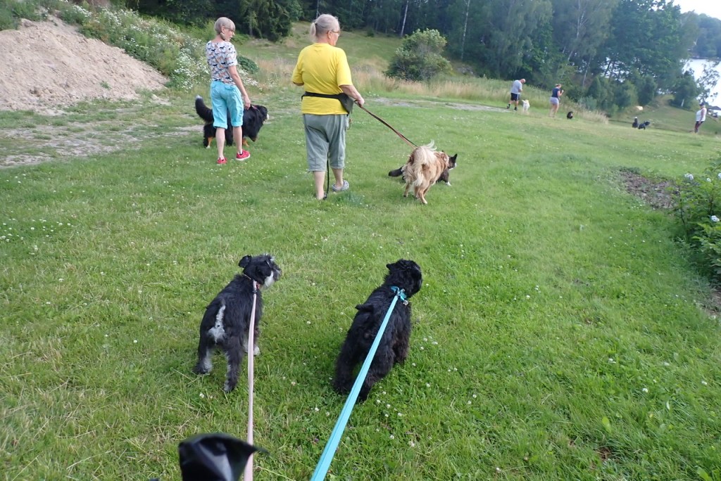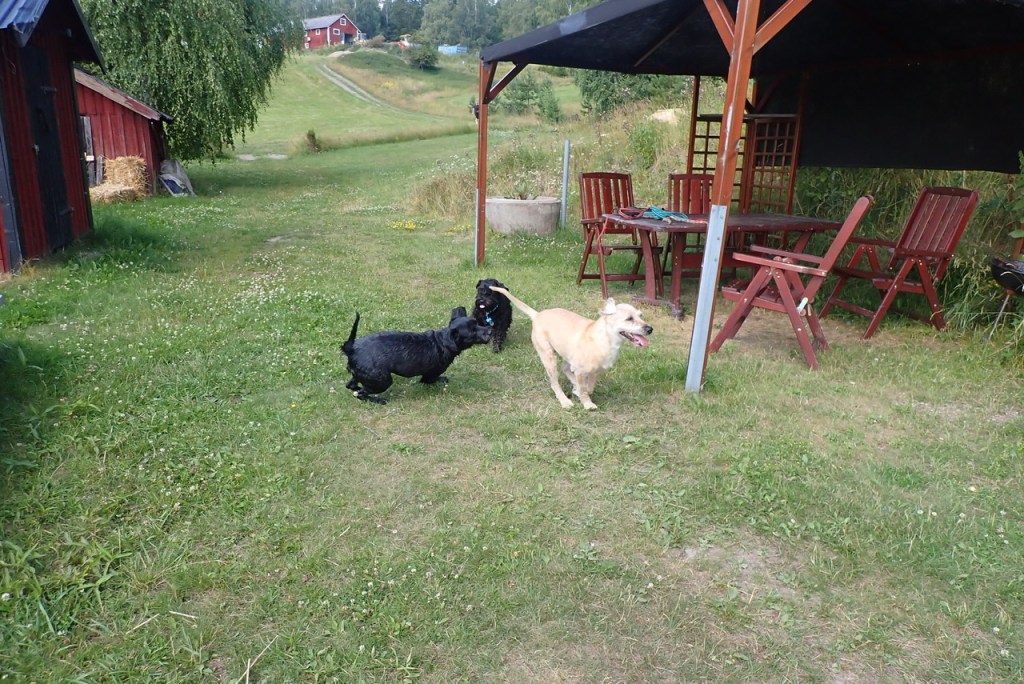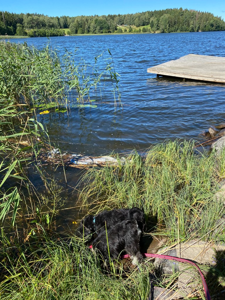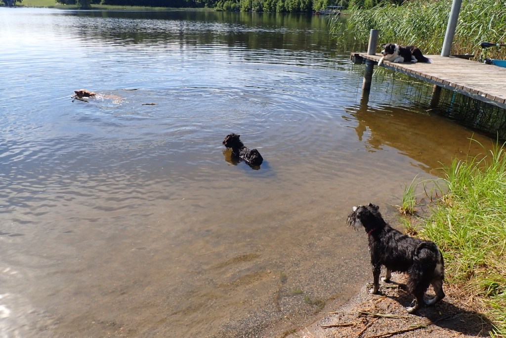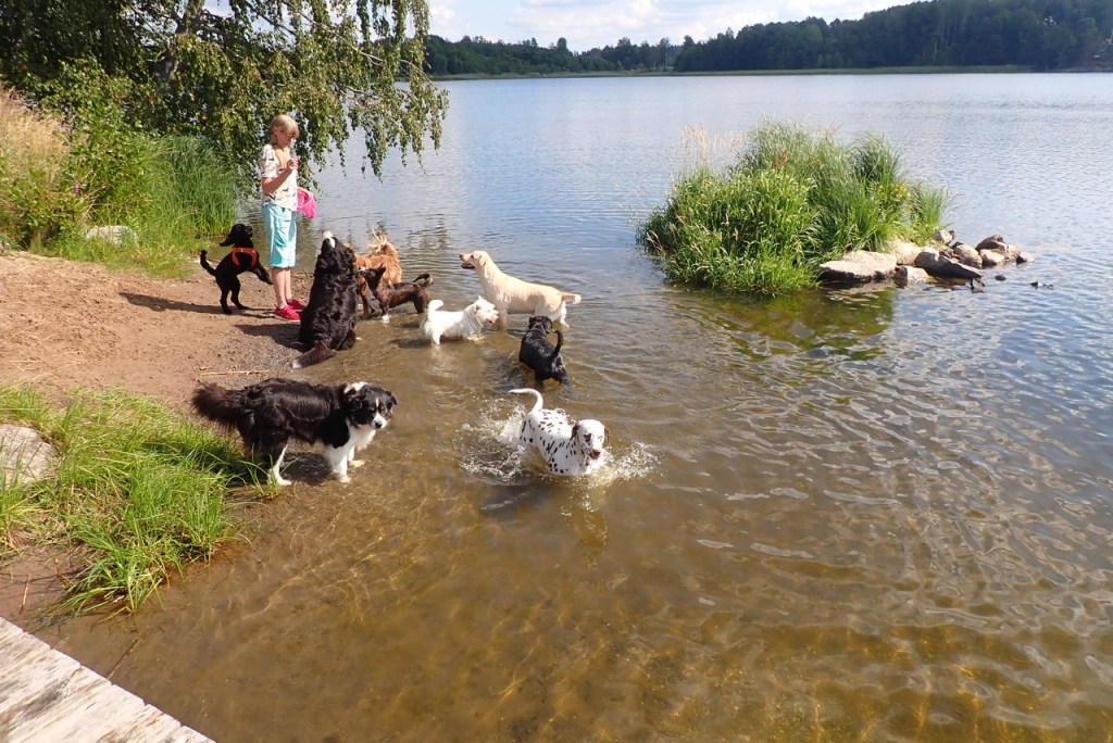 Hosjön är ganska grund cirka 7 m på det djupaste stället så vattnet blir fort varmt, cirka 20 ˚ idag. Alla hundar badade mer eller mindre.