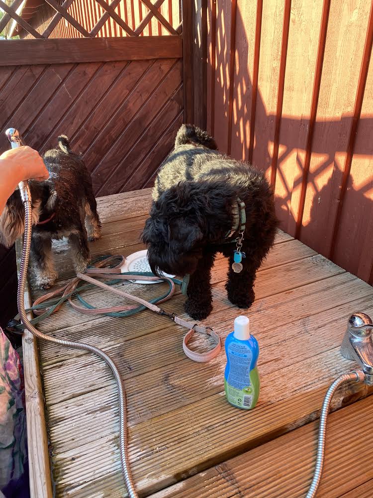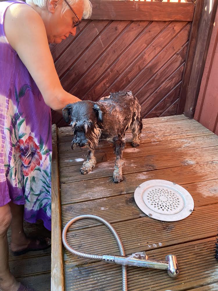 Efter några härliga veckor med ler- och dybad samt rullning i något odefinierbart får matte en allvarlig knäpp. Hon får sådana med jämna mellanrum. Man hammar här i hundduschen och så sätter hon igång men detta evinnerliga spolande med vatten. Denna gång med sånt där super äckligt schampo, man blir helt inbäddad i lödder. Vad har vi gjort för att förtjäna detta. Ni luktar som små grisar svarar hon, hur tusan luktar då små grisar undrar jag? Ja inte av något äckligt schampo iallafall!!