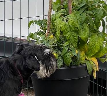Hemma vid vagnen och nu var det dags att kolla om tomaterna är färdiga. Bakom bladen finns det många goda gula tomater. De är ät klara så jag snor åt mig en eller två innan någon ser mig.