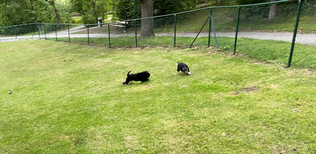 I dag skall vi hem till stan, det gillar vi inte alls. Men när vi går till vår hage och får springa på fri tass är det rätt OK att vara hemma i stan.