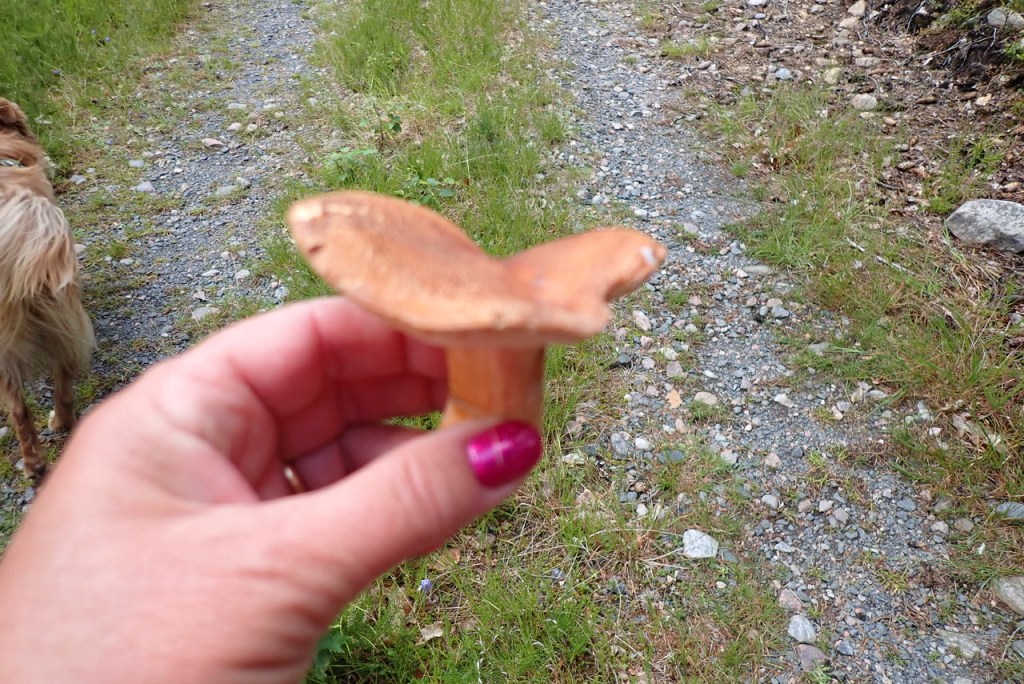 M vart jättestolt för hon hittade sin första svamp en mandelriska. M kan ingenting om svampar men Helena kan jättemycket. Många olika sorter fanns längs vägen.