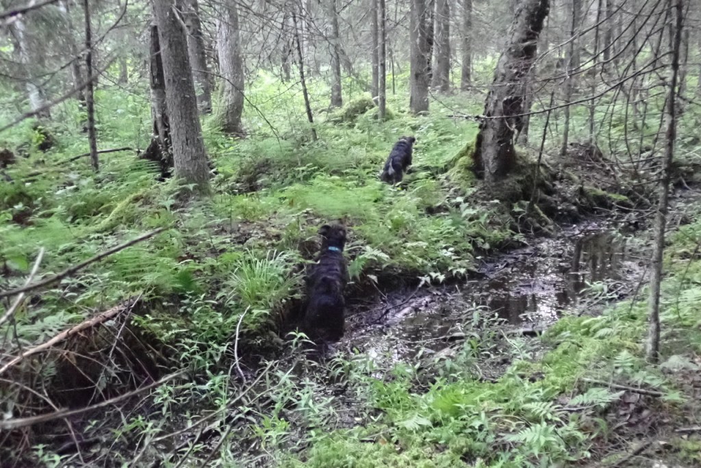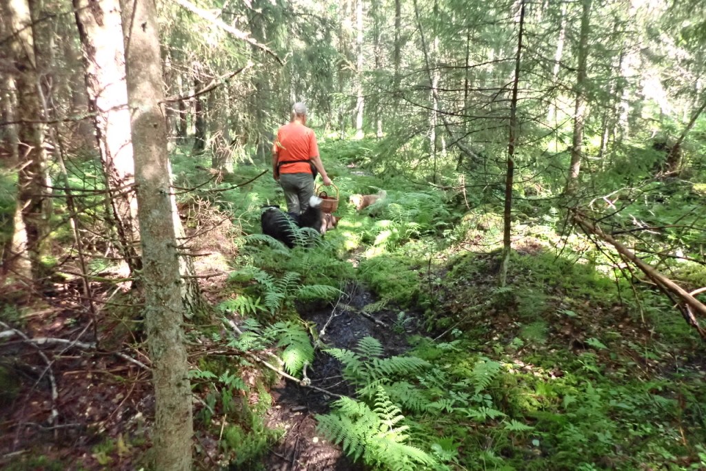 Vi träffade gänget vid macken för att åka till ett nytt ställe att promenera på. Stället heter något med träsk, låter lovande tycker jag. Vi körde i väg och parkerade efter ett tag. Vi gick in i skogen och kom till en sänka och mycket riktig där fanns ett litet träsk! Alla utom Wilma körde lite pälsvård genom att kuta runt i vattnet. Jenna och Basse badade hela kroppen förstås.