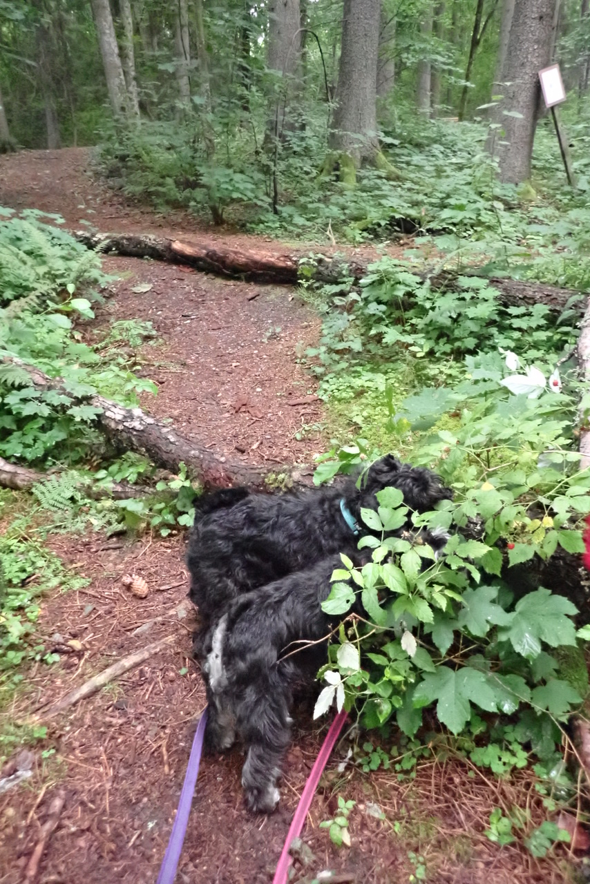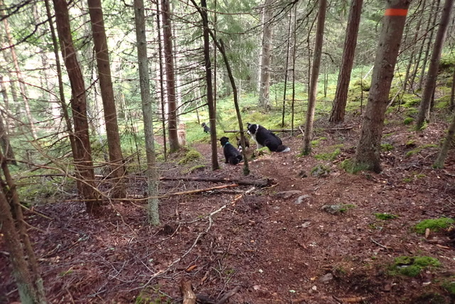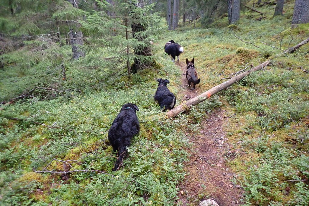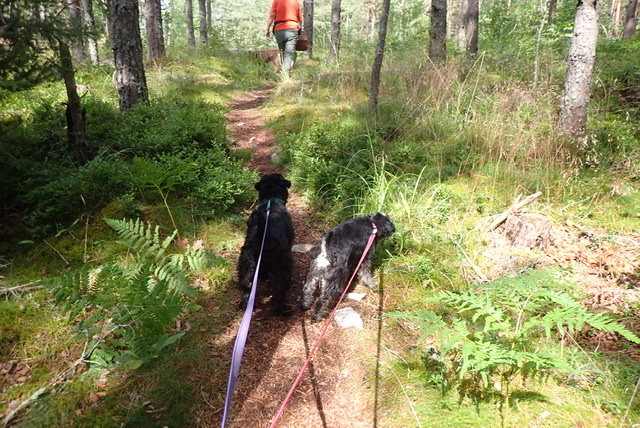 Kvällsturen gick genom skogen bakom campingen. Där går det väldigt många hundar som lägger ut sina visitkort. Det är som att gå i en parfymbutik och det tar tid trots att det inte är så långt.