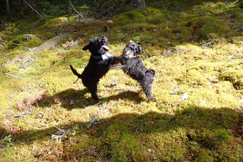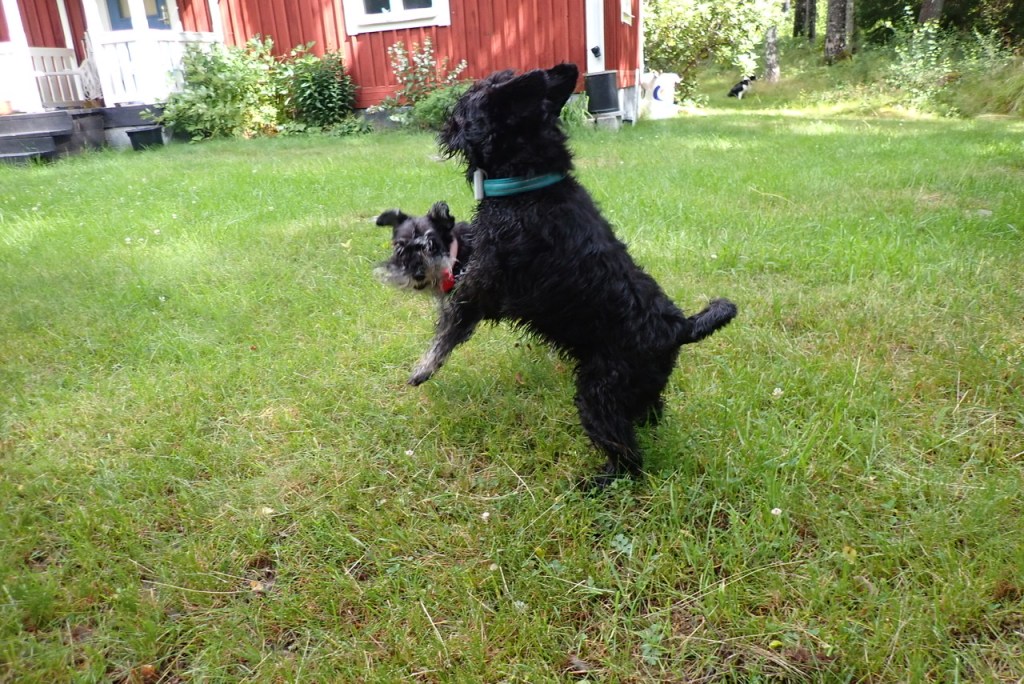 Troy och Basse lekte med en pinne. Basse är bra på att hitta goa pinnar.