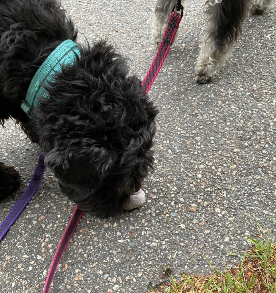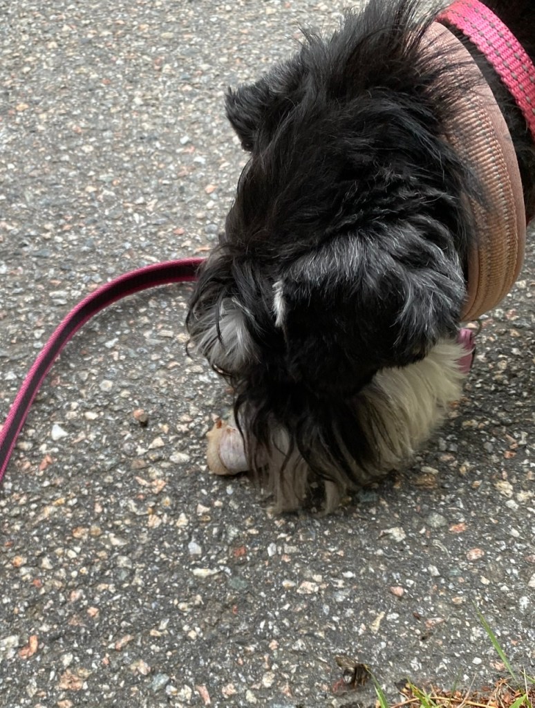 Det har regnat väldigt mycket och på kvällsturen såg vi några konstiga saker krypa runt på marken. M säger att de heter Vinbergssnäckor och är ätliga sniglar. Fast de smakar mest som vitlökskryddade suddgummi, men det säger mig inte något för jag brukar inte äta suddgummi. Vi undersökte dem iallafall och fann dem inte vara av intresse ätliga eller ej. Sen säger M att vi har konstiga matvanor!!