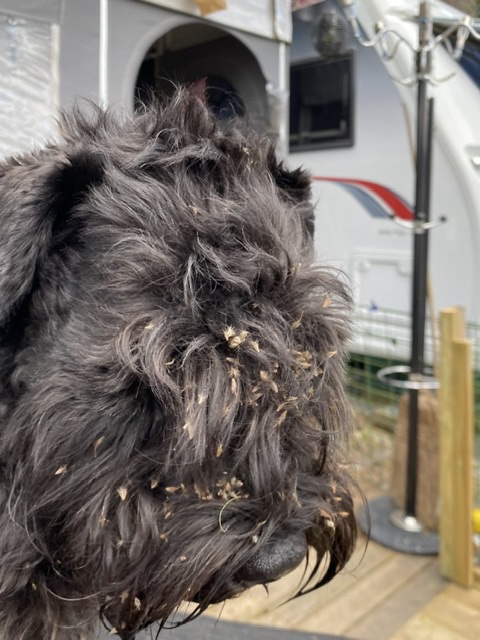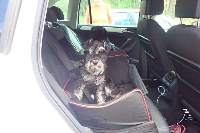 Ny dag ny tur. Vi var själva och gick den sk. Östersjörundan cirka på 2,5 km. Matte suckade högt för vi hade rusat igenom ett buskage och fått massor av frön i hela pälsen. Det roliga har tyvärr alltid ett slut i bland blir det lite mindre roligt. När vi kom tillbaka till vagnen kom trimbord och karda fram. Troy som hade mest frön åkte direkt upp på bordet. Jag smet undan, in under vagnens soffbord och försökte sanera mig själv för att slippa kardningen. Men icke jag hamnade där jag också. Jag hade inte lika mycket frön och det berodde nog på att Troy sprang först genom buskarna.
