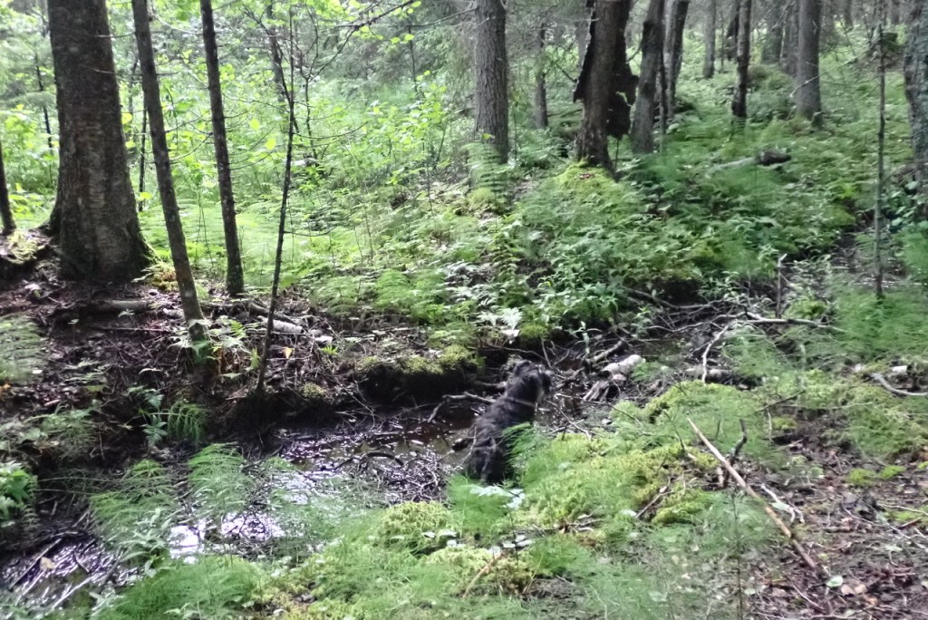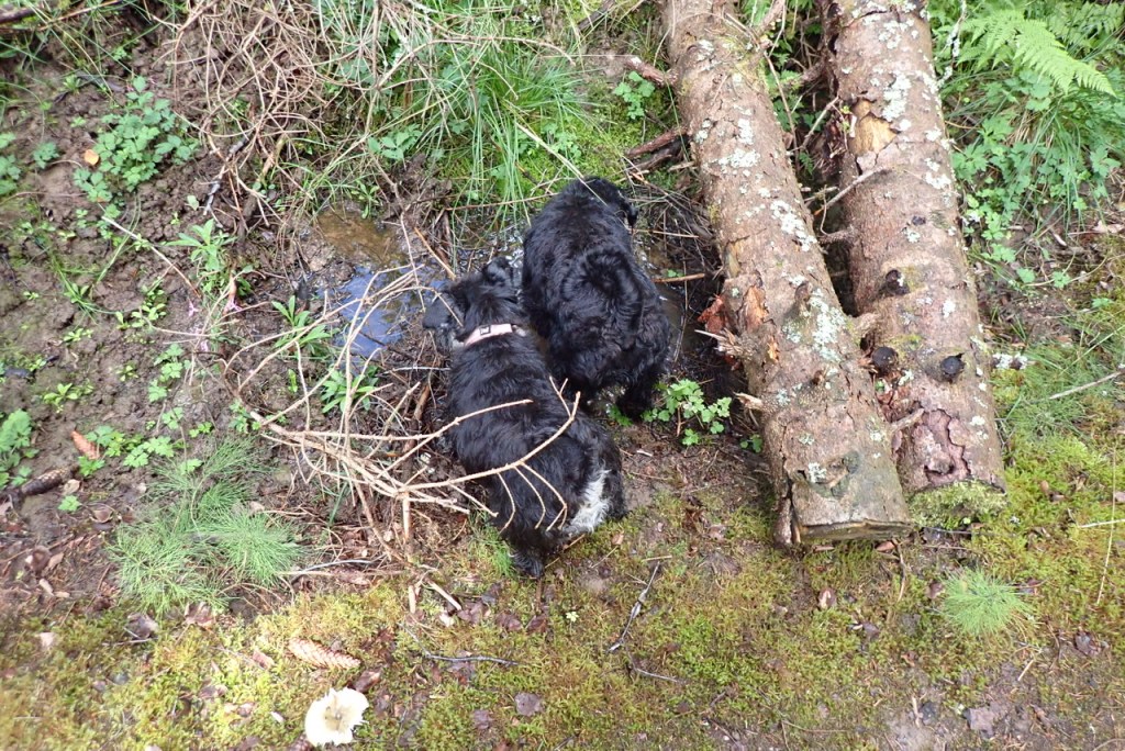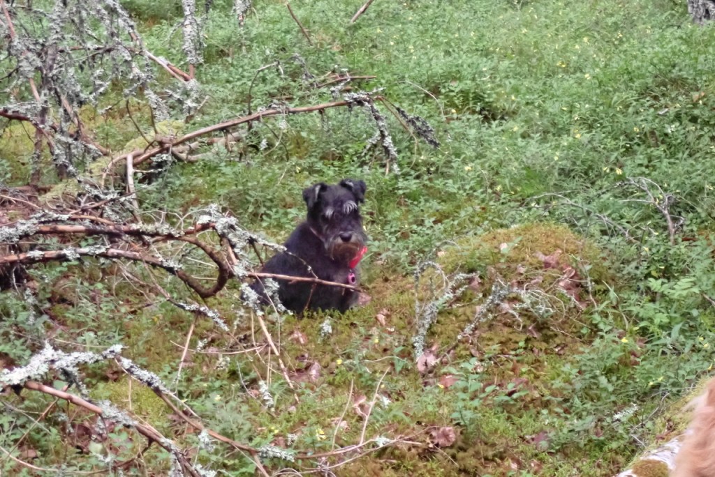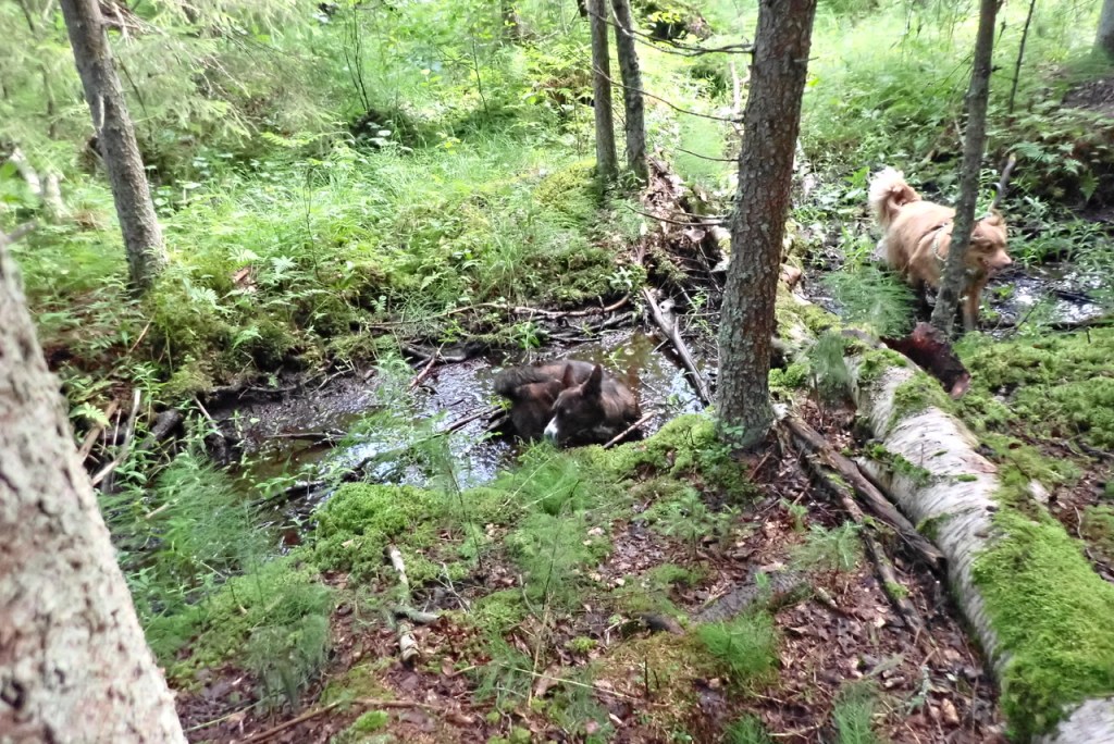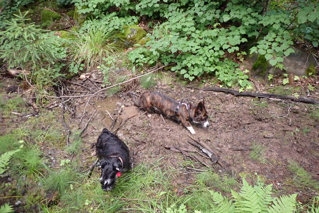 Lite mer pälsvård i en gyttjepöl han vi med. M suckar bara, hon förstår inte det härliga med gyttja. Hon tror att blandningen grankvistar och gyttja inte är så bra.