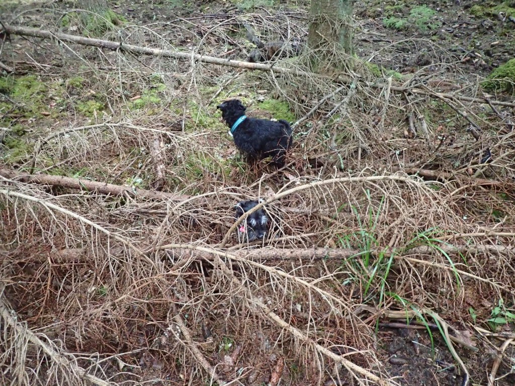 Sen hamnade jag i klistret eller rättare sagt i granruskan. Jag såg mig inte för och hoppade galet i min framfart. M var på väg i stora kliv för att rädda mig men bra brud klarar sig själv. Jag lyckades ta mig igenom på egen hand. Tyvärr till priset av en massa kvistar i pälsen. Troy vände och gick runt så han klarade sig. Smart kille!