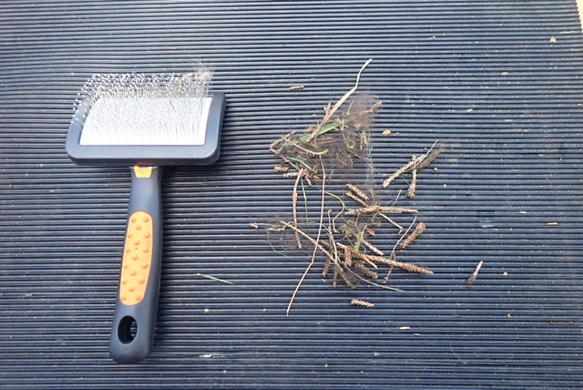 Mindre roligt var det att reda ut pälsen efter att vi kutat runt i skogen och ha spabadat. Detta är resultatet av rensning av Troys framben. Jag var lite orolig en stund för att vi skulle hamna i hundduschen men vi klarade oss iallafall från den pinan.