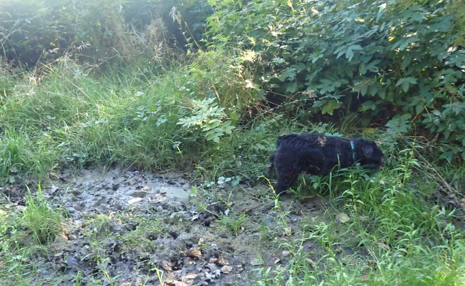 Troy har blivit duktig på att hitta lergropar. De måste man trampa runt i innan man kollar av omgivningen. M suckar och säger, men lilla söta du är det där nödvändigt?