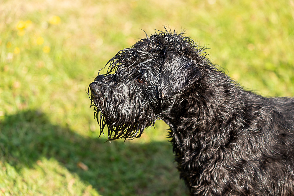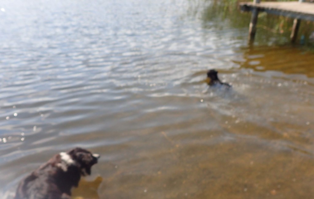 Sen gick vi ned till stranden och badade. Troy börjar bli badgalen han går i och simmar självmant i synnerhet om Basse har en pinne och simmar runt. (Ursäkta den suddiga bilden)
