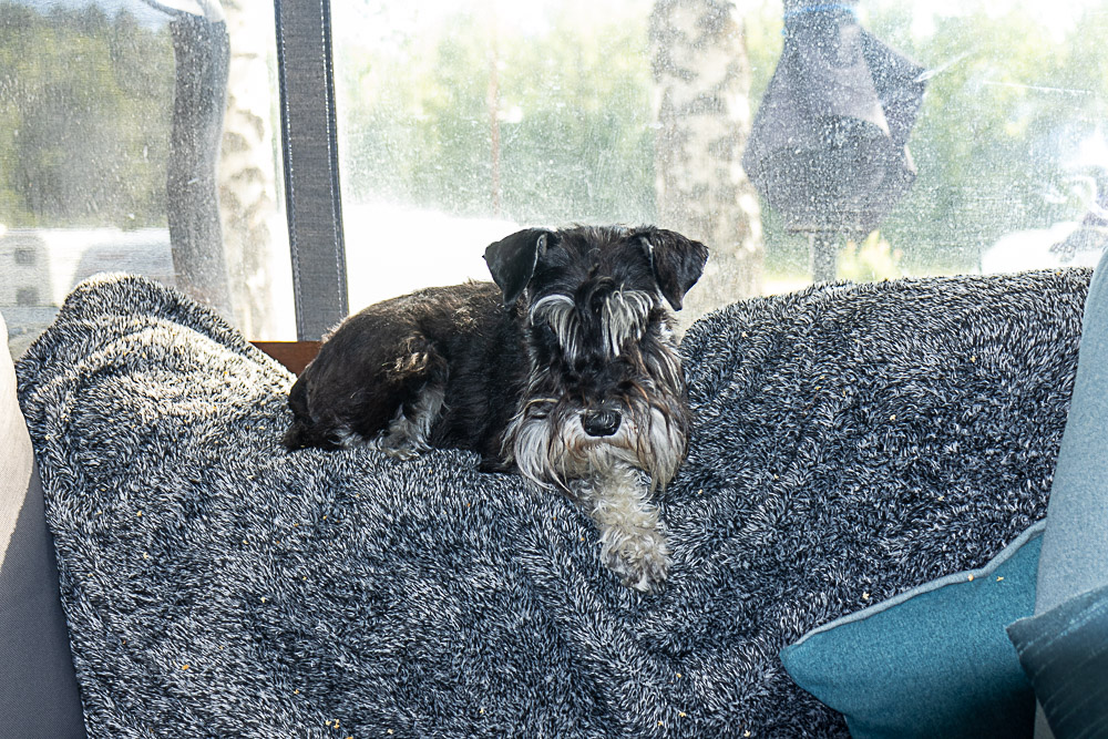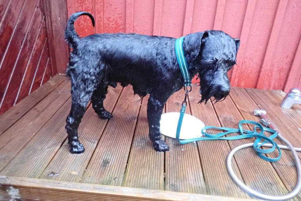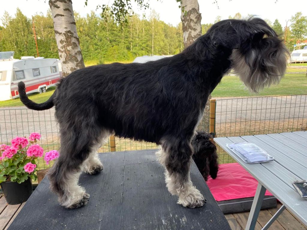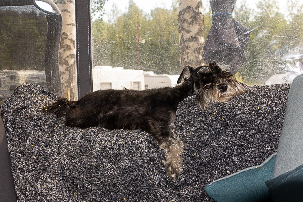 M säger satt jag är en lurvitutt som behöver trimning så då hamnar man här. Fixar matte har ordnat med ett trimbord här på campingen, vilket jag tycker är helt onödigt. Å så skall man stå fint också M säger att jag står som en påse nötter, vad menar hon med det?