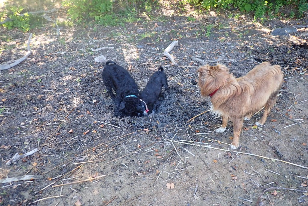 På strandkanten kände vi att något fanns där nere i leran. Vi gjorde gemensam sak och grävde upp ett stort hål. Troy började äta av leran som fanns där nere i hålet. Då kom taskmörten matte och la igen det fina hålet. Obegripligt