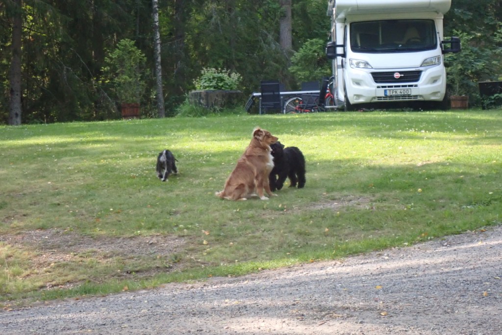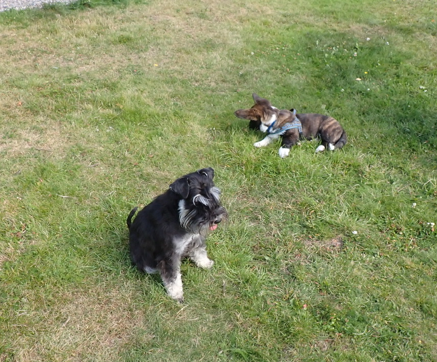 Lilla söta valpen Benito (en Corgie) kom och när några större hundar var lite för tuffa mot honom gick jag dit och jag fräste i ”STICK Å BRINN BARA, LÅT HONOM VA”. Jag visade alla mina vackra tänder och gjorde ett lufthugg. Alla vovvarna backade och fick plötslig väldigt bråttom att göra något annat det var viss något intressant vid poolen. Sen satte jag mig i närheten av Benito utifall någon annan behövde få på moppo! Små valpar skall man vara snäll mot annat är det med slynglar, de kan behöva lite stryk under stundom. Det är jag också bra på. Benitos husse var väldigt imponerad av mig och sa att jösses vad tuff hon är. Självklart sa jag, jag är vassaste bruden söder om Dalälven. Norr om den känner jag inte till så bra men det kan vara så att det gäller samma sak där. också!