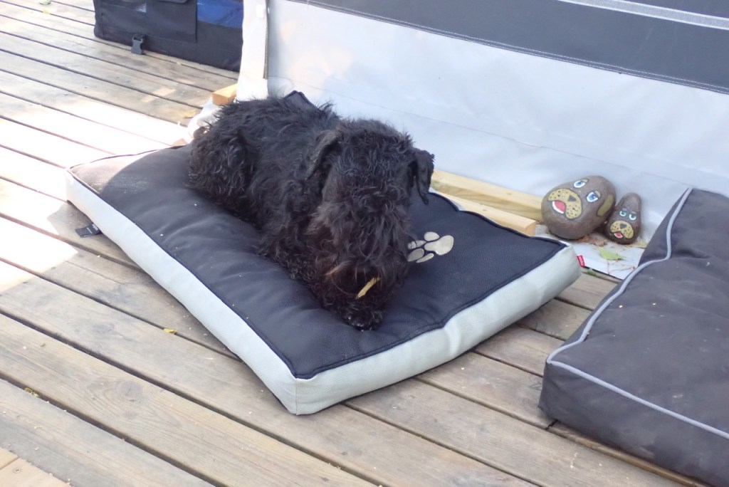 Efter att ha plaskat runt i poolen tog Troy sig ett sandbad under däcket. Det skall vara mycket bra för pälsen har vi hört. M är mindre glad men när han torkat och ruskade sig flög sanden all världens väg. Bra sa M som inte vill ha Jehanders sandtag i bilen. Hon är bra kinkig tycker jag.