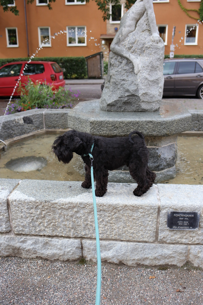 Där finns sen många år en liten fontändamm. Troy ville bada men fick nöja sig med att gå på kanten. M badade en gång i den som liten fast hon egentligen inte fick det.