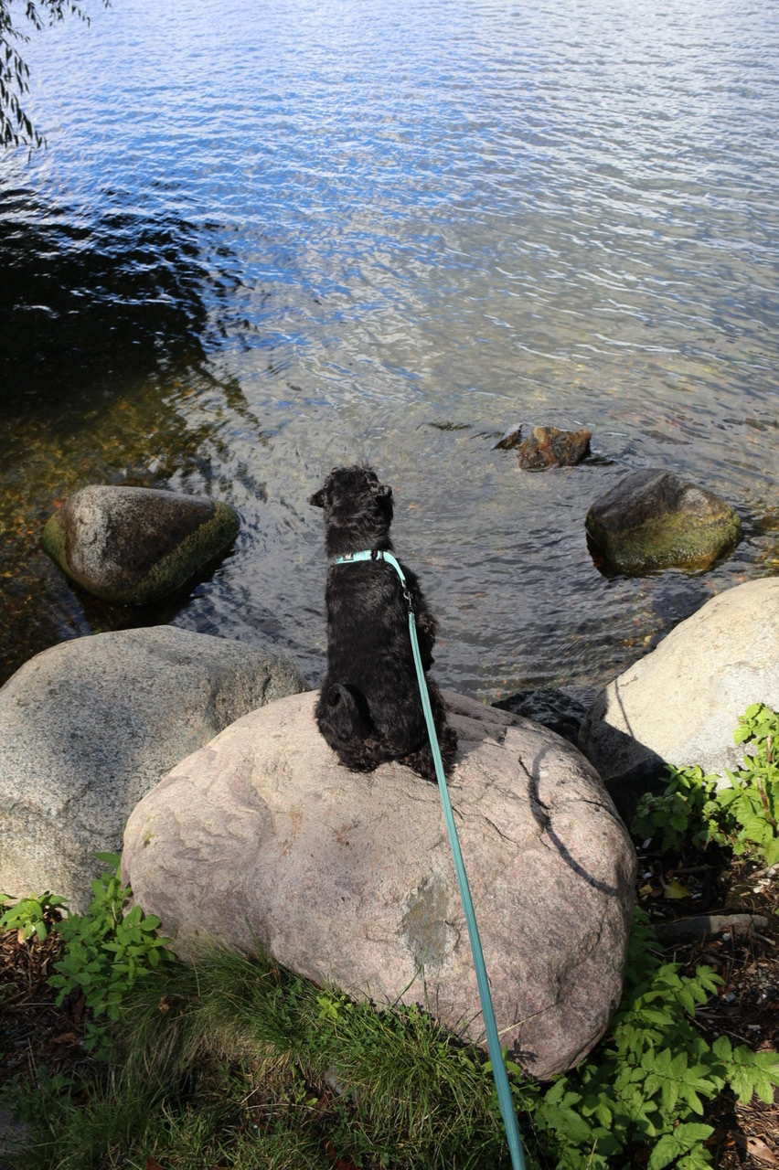 Troy tar sig en liten stund till att sitta på en sten och fundera lite. Där sitter han och kollar ut över Mälaren. Han får sitta där för M tycker att egna små stunder är viktiga att få ha. Efter ett litet tag kommer han och vill gå vidare. Ingen vet vad det är han filosoferar om. Jag tar mina egna små stunder med att t.ex gnaga på ett revben, helst på utkiksplatsen i fönstret hemma.