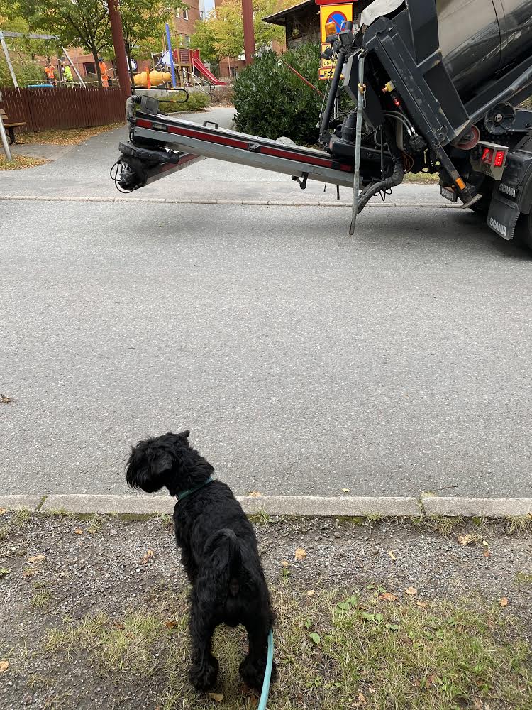 Nu skall vi ta en prommis men först måste Troy kolla på när de jobbar med att fixa till lekplatsen utanför vår port. Som vanligt är han väldigt intresserad av arbetsmaskiner och killar i arbetskläder.
