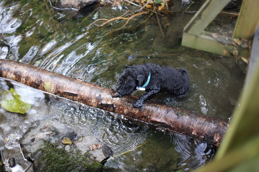 Troy kan naturligtvis inte gå över bäcken på bron, han skall prompt i och bada. Lite knepigt blir det för honom att ta sig över den hala stocken som ligger mitt i bäcken. Det gick bra kan jag meddela men jag begriper mig inte på varför han prompt måste i jämt. Jag nöjer mig med att gå ned till kanten och dricka lite av det goda vattnet utan att ens bli våt om tassarna.