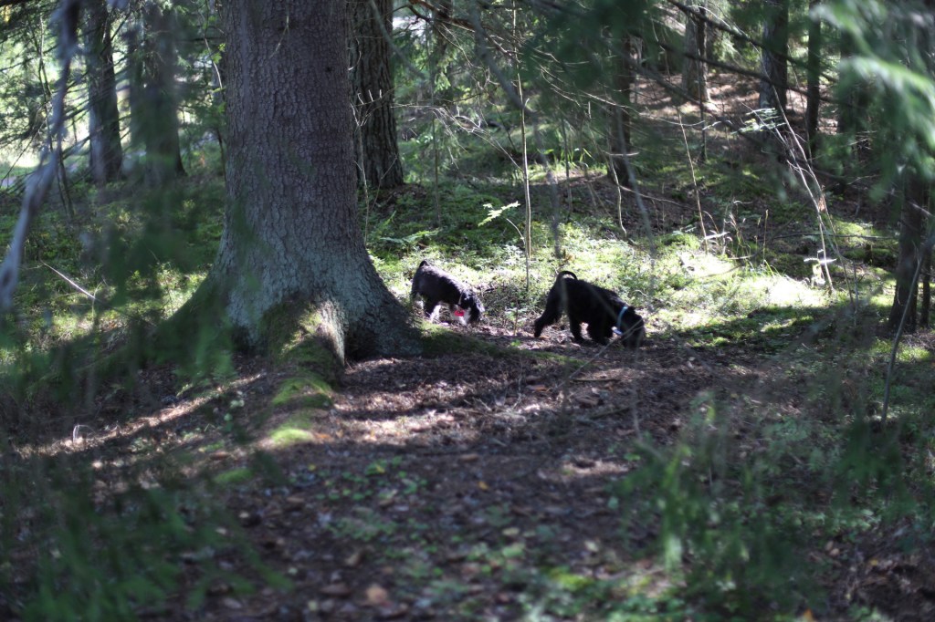 Jippi! Helena hade lagt ett blodspår. Nu skulle vi kolla om Troy hade fattat vad det handlar om och att han inte bara följde efter mig förra gången vi gjorde det här. M släppte honom först och han for iväg som en raket med nosen i backen. Wilma och jag fick frihet ganska omgående för det var ingen som helst tvekan om att han fattat galoppen. Vid spårslutet fanns många godsaker utspridda så vi fick leta en god stund innan vi hittat allt.