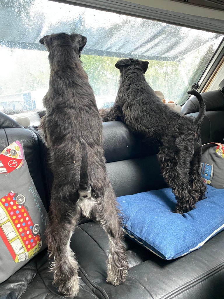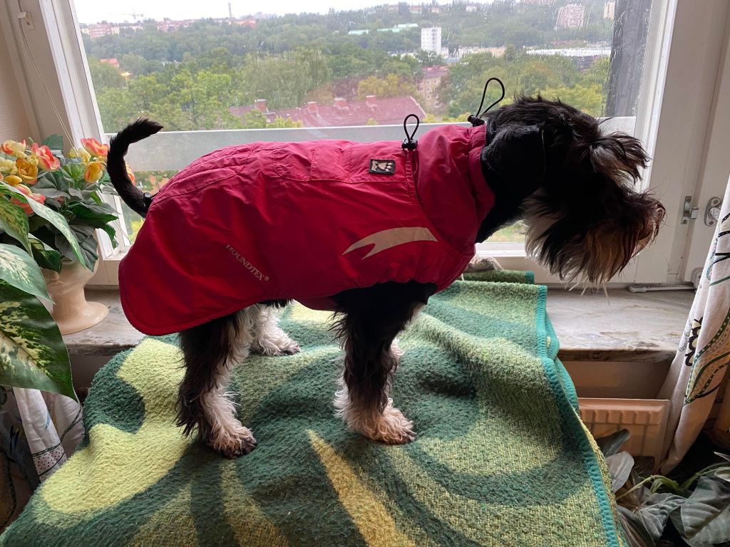 Lördag och det regnar så vi gör oss osynliga så M inte får något oövertänkt ryck och släpar ut oss. Hoppas hon har köpt något lördagsmys åt oss för ut vill vi inte gå ut för då kan man ge sig tusan på att regnkläderna kommer fram. De är förhatliga och framkallar akut förstelnings syndrom hos oss båda.