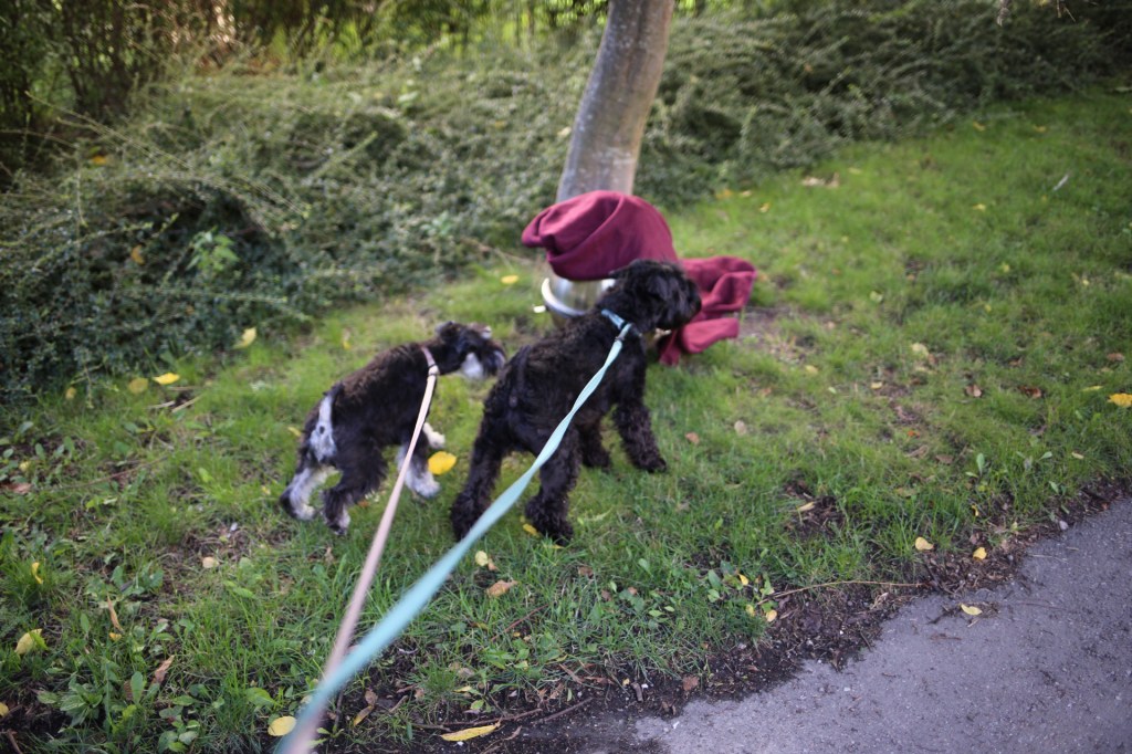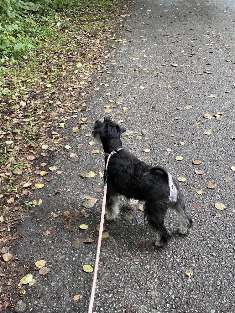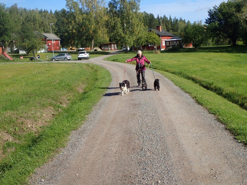 Vi lyckades med gemensamma krafter att övertala M om att vi måste gå efter henne och kolla så hon inte gått vilse i skogen. Wilma var väldigt orolig för sin matte och tog ledningen i våran räddningsexpedition. Det där med att hålla rätt på tre koppel är lite besvärligt för M