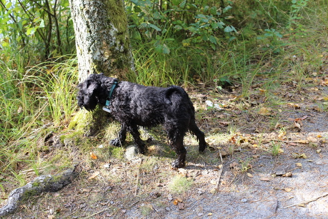 Husse gick på gångvägen tillbaka till bron. Vi gick igenom skogen men jag hade full koll på var han var hela tiden. Vi sprang lite före för att hinna ikapp honom och jag hittade honom direkt där han satt på en bänk och väntade på oss . Jag gillar inte att flocken delar på sig det blir så jobbigt att hålla koll på var alla är.