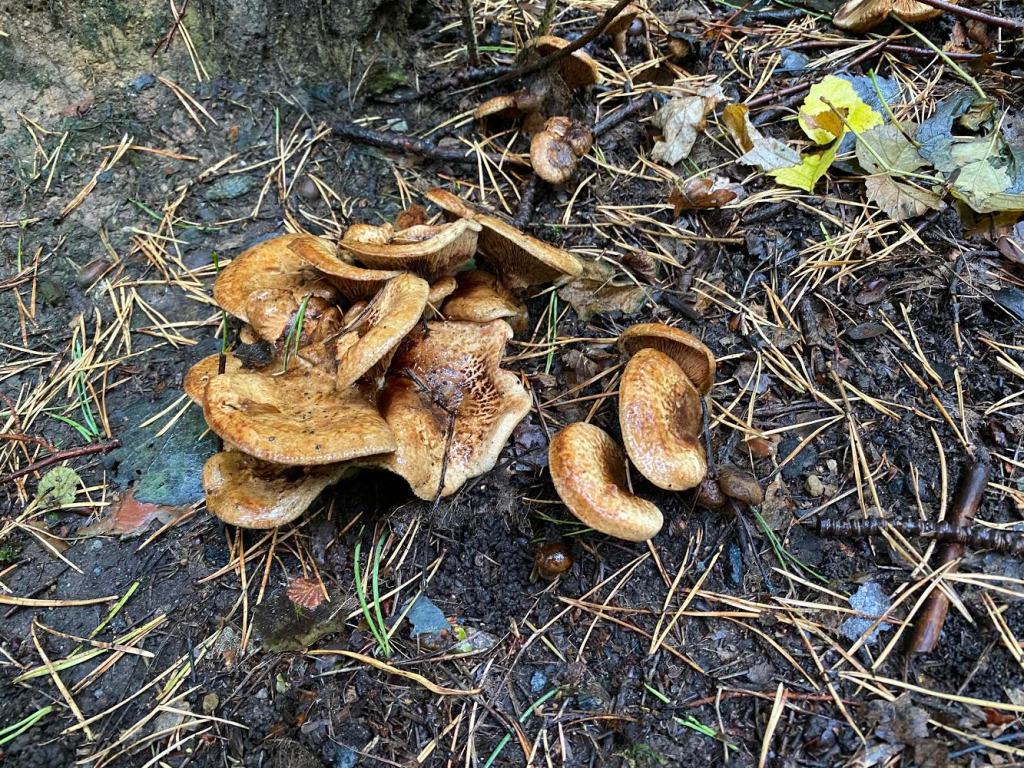 Vi gick ut och då regnade det inte sen började det och det blev bara värre och värre. M hittade en spännande svamp och ton en bild på den. Det växer mycket svamp på norrsluttningen bakom vårt hus. Som tur var fick den vara kvar i skogen för vår kompis Helena som kan väldigt mycket om svamp sa att det är en pluggskivling och att den är giftig! M är duktig på att hitta oätliga och giftiga svampar så när vi kommer hem skall jag beställa en svampbok till henne så jag slipper oroa mig.