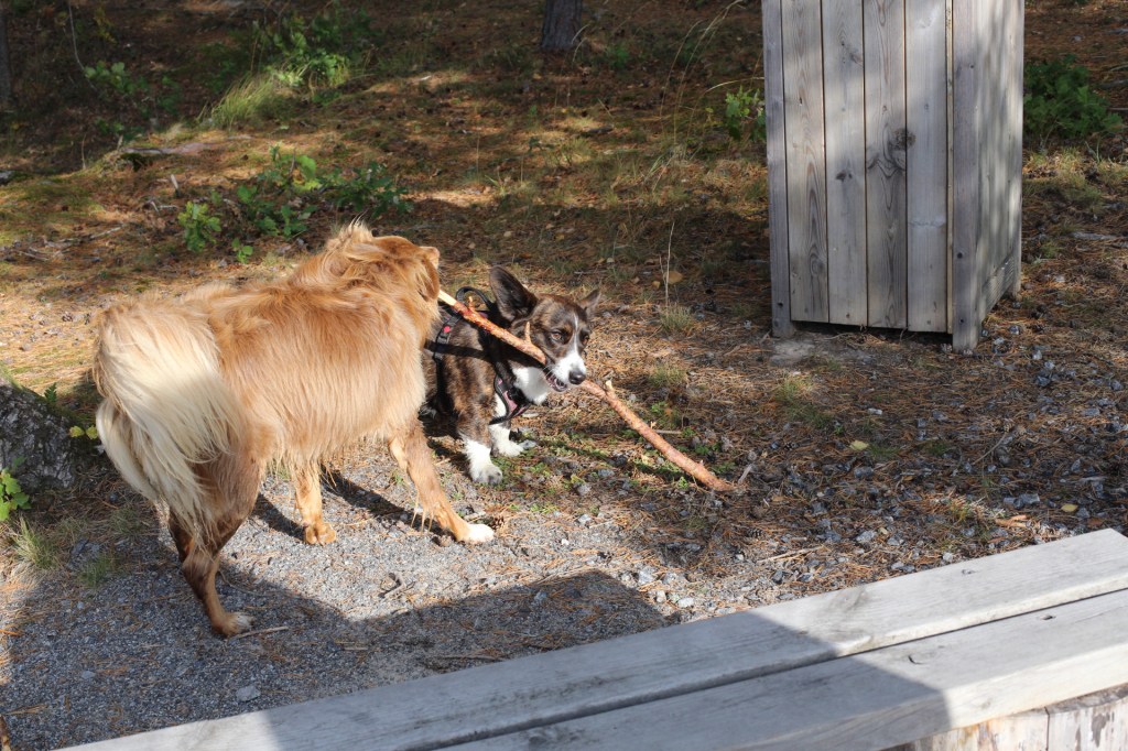 Basse och Jenna ägnar sig åt favoritleken, drangkamp om den enda pinnen som finns i hela världen.