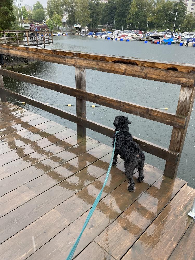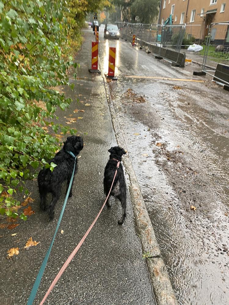 Nu tar jag saken i egna tassar och visar vägen hem. Det regnar otrevligt mycket och jag är genomvåt rent av dygnsur på mervärde ett sätt. Vem sa att detta är hundväder.