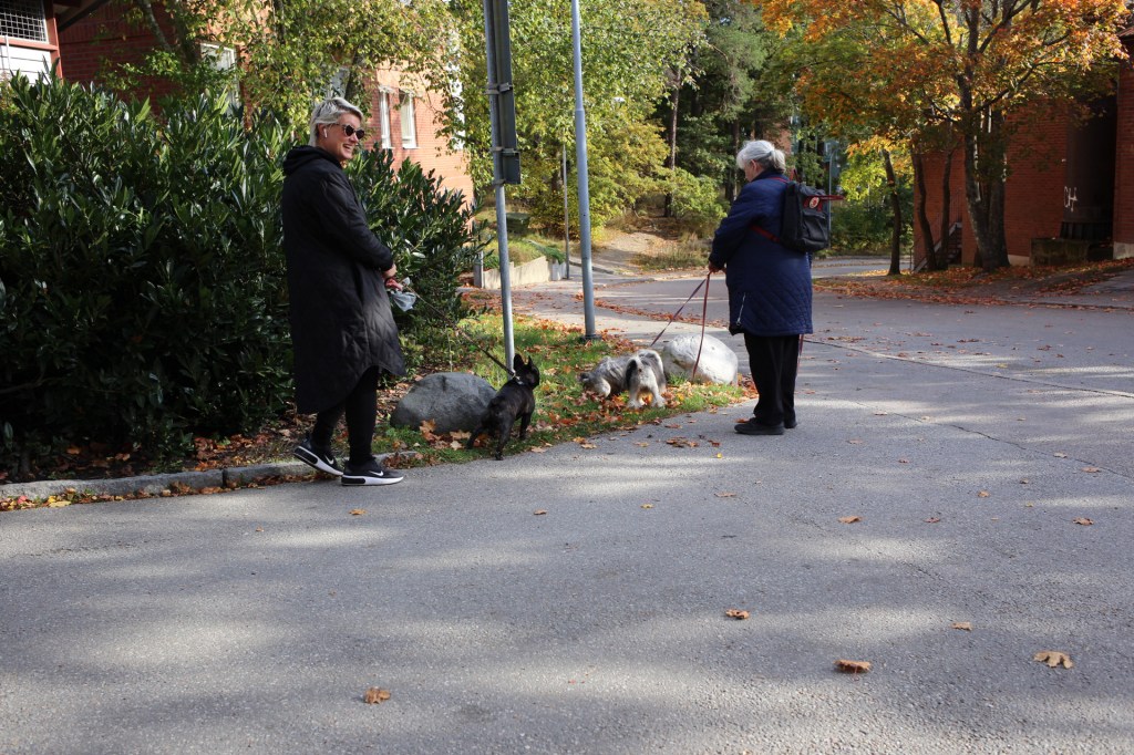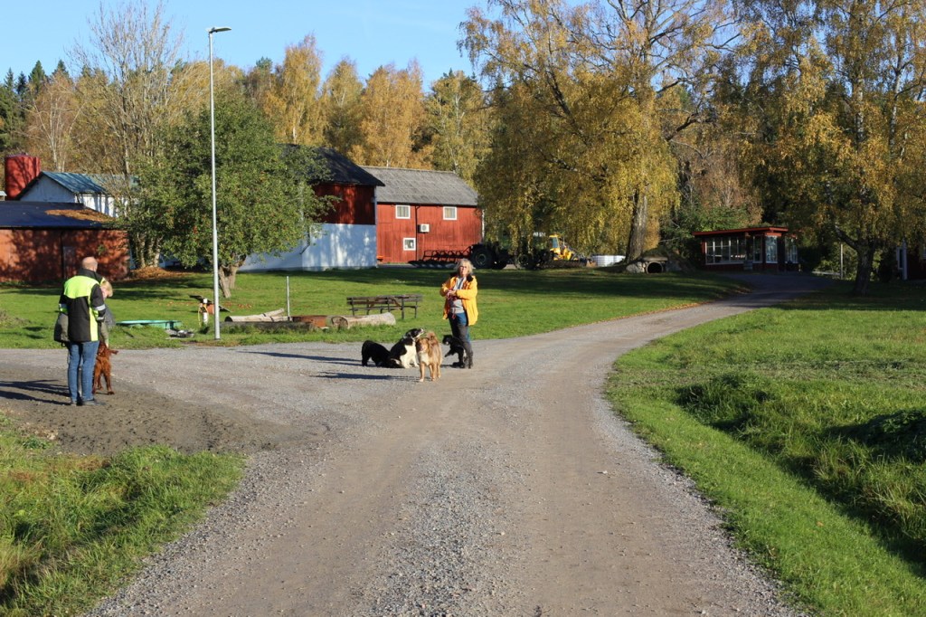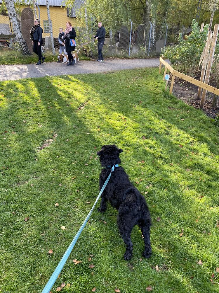 Många är ute i det fina vädret. Det är lite jobbig för vi får ha söndagsskola dvs. inte rusa fram till eller skälla på förbipasserande hundar. Ibland måste vi sitta fint bredvid matte eller gå vid hennes sida. Vi har lärt oss att om vi gör rätt får vi godis och det kan man ju inte missa!