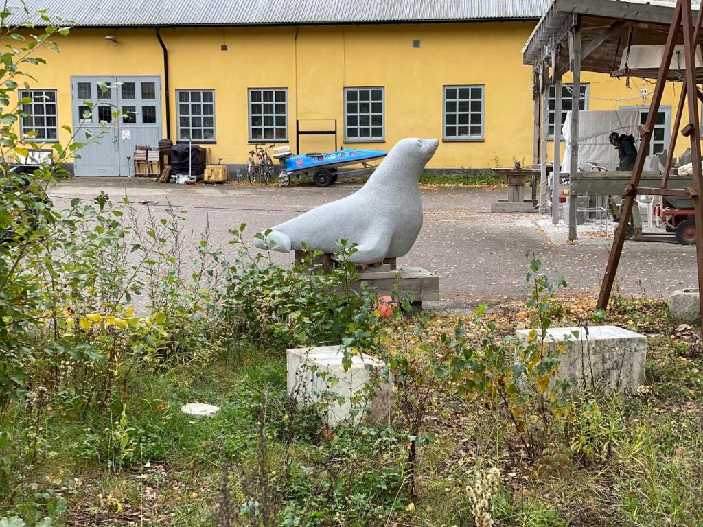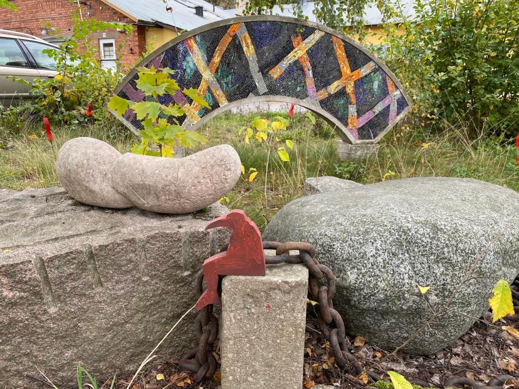 Innanför staketet till skulpturverkstaden i Vinterviken finns det både små och stora skulpturer. Vi stannar ofta och tittar in och där vi hittar hela tiden nya saker.