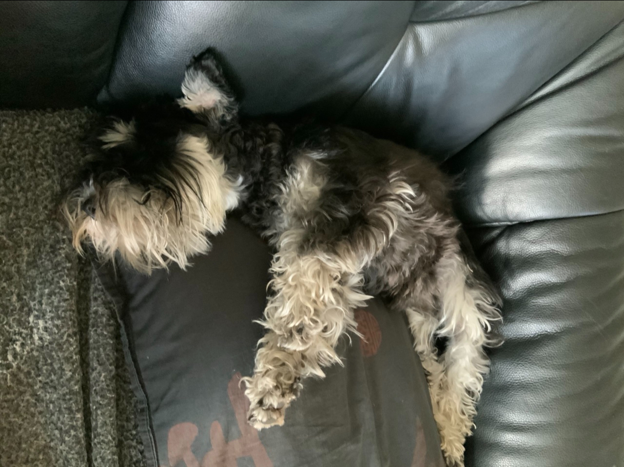 Man blir trött av söndagspromenaden eftersom man möter mycket tvåbeningar och hundar. Tar en eftermiddags lur på min kudde i soffan. Härifrån kan jag hålla koll på köket så jag inte missar något gott som är tiggningsbart.