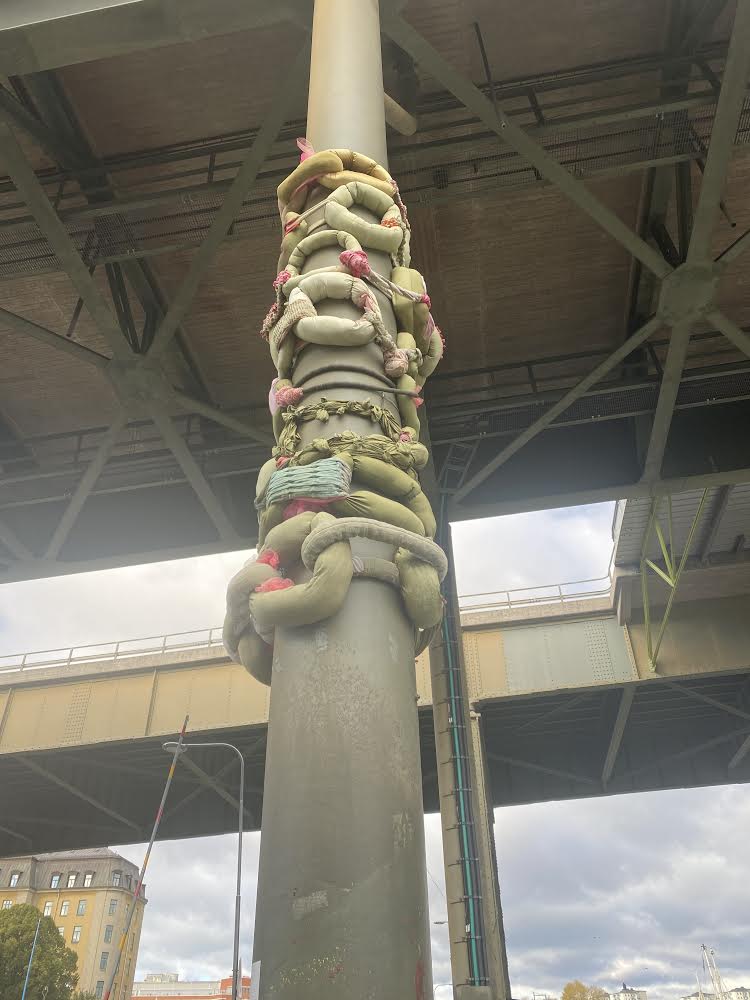 Högt uppe på en av bropelarna på Liljeholmsbron satt några konstiga saker. Det skall tydligen vara ett konstverk. Ja jag fattar då nada. Lite synd att de satt så högt upp för det hade varit kul att slita lite i det.