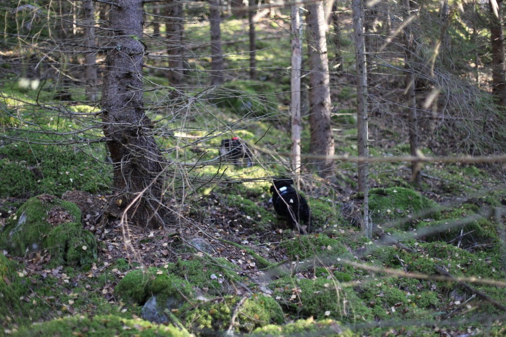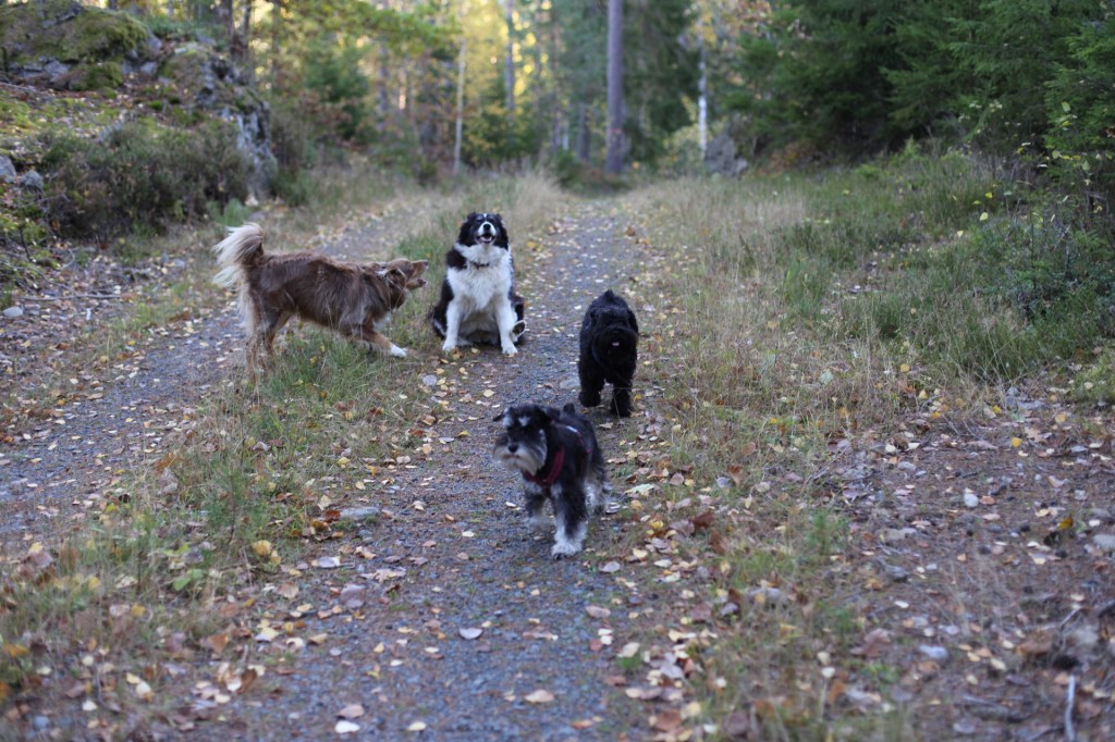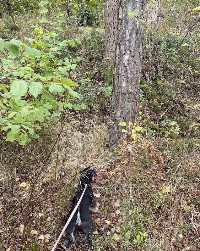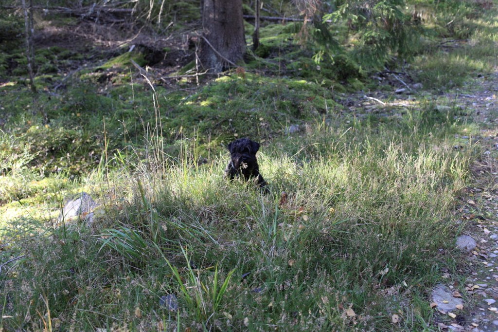 Äntligen framme, Wilma, Basse, Troy och jag fick vara på fria tassar. Helena hittade lite svarta trumpetsvampar. När hon böjer sig fram för att plocka svamp passar jag på att pussa henne och slicka lite på hennes glasögon. Hon säger, men Moha då nu ser jag ju inte ett skvatt, sen får jag lite godis, bra va!