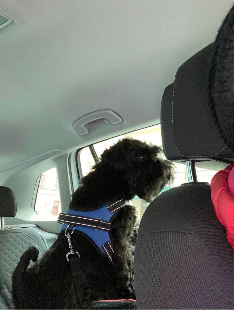Matte det är jättetidigt, vad skall vi ut och göra nu? Vi brukar ju ta lite sovmorgon efter första Arla morgonpinket, inte åka bil. Va skall vi åka till engelska skogen och träffa Helena och gänget. Vi skall alltså åka många mil för att få en härlig skogspromenad med bästa kompisarna.