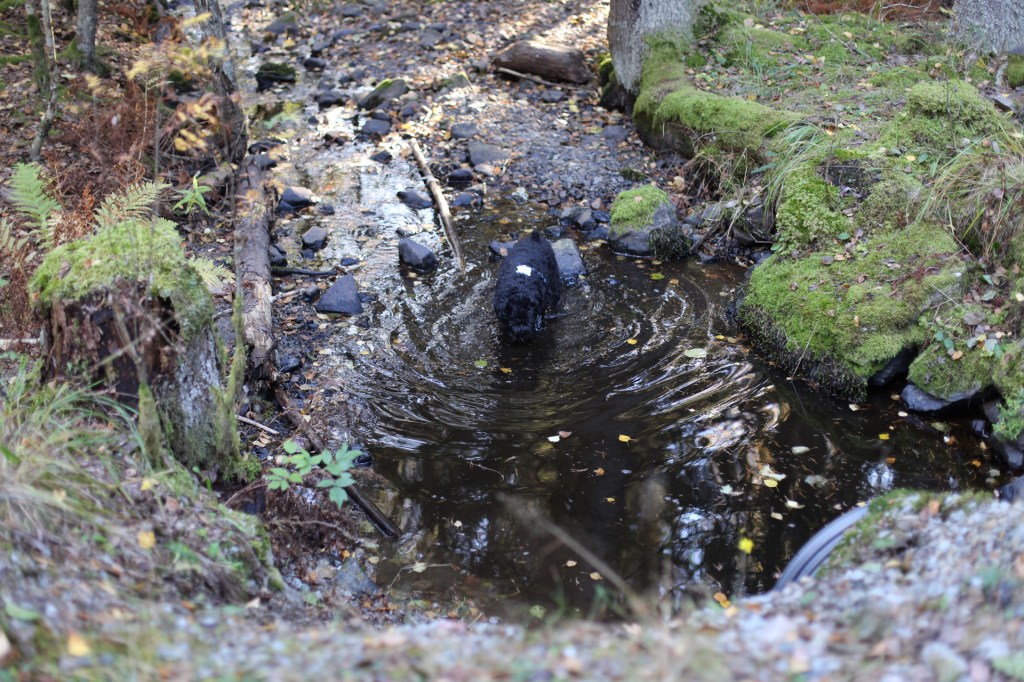 På väg tillbaka till bilen tog Troy sig ett bäckbad. Matte tyckte det var bra att han sköljde bort lite jord efter grävandet efter möss eller vad det nu var i jordhålan.