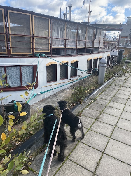 Vi gick vidare längs kajen och där ligger det båtar som folk bor på. Det verkar spännande men vi fick inte gå ombord. M är lite kinkig tycker jag.