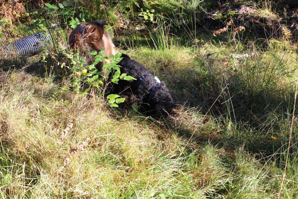 Basse hittade en spännande jordhåla som han började gräva i. Efter en liten stund tog Troy över och grävde vidare, det blev till slut en ganska stor grop. Jag tror att de jagar möss men ingen var hemma i hålet så de fick vara utan något byte!