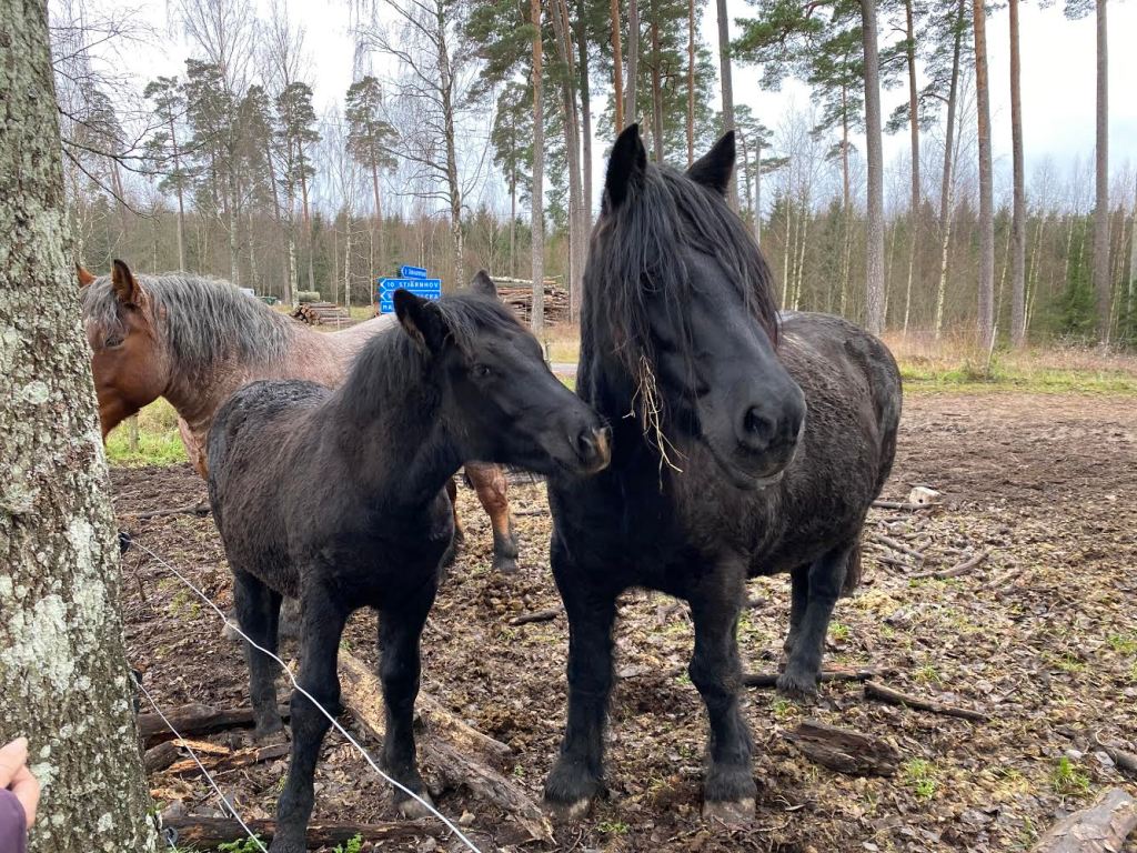 När vi kom tillbaka till bilarna stod det några monster alldeles intill bilarna. Mattarna såg inte hästmonstren så alla vi fyra skrek i högan sky och hotade dem med att vi skulle äta upp dem. Mattarna frågade om vi blivit helt tokiga innan de såg monstren. Men då är frågan vilka som är tokiga! Vi åkte alla in i bilarna och blev tillsagda att vara tysta. Sen börjades det att jollras, å så fina ni är! Det klappades och gullades i kubik med monstren. Jag surade sen i flera mil över detta!