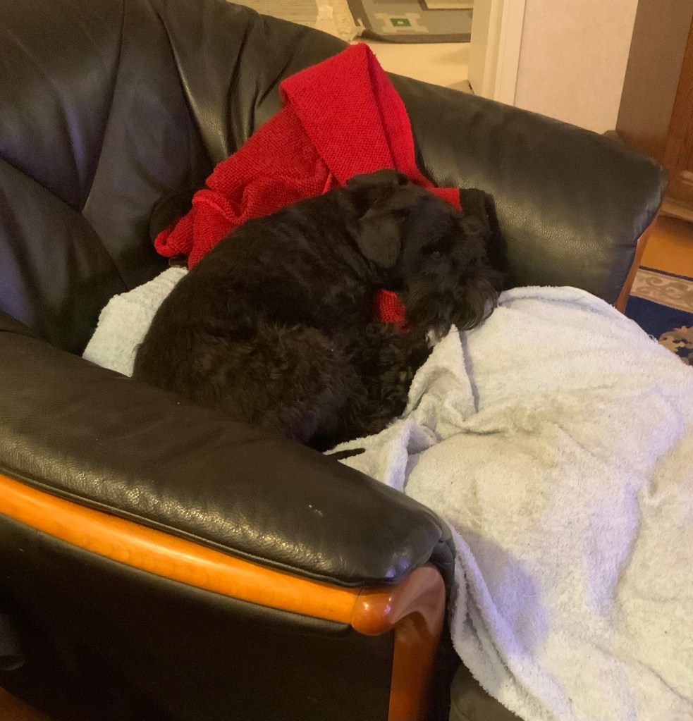 Troy bäddar i fåtöljen och drar ned mattes tröja som han lägger sig på och vilar lite efter regnpromenaden! Matte blir lite rörd och så får han en liten nospuss. Det tycker han om för han har något knorrade ljud för sig.