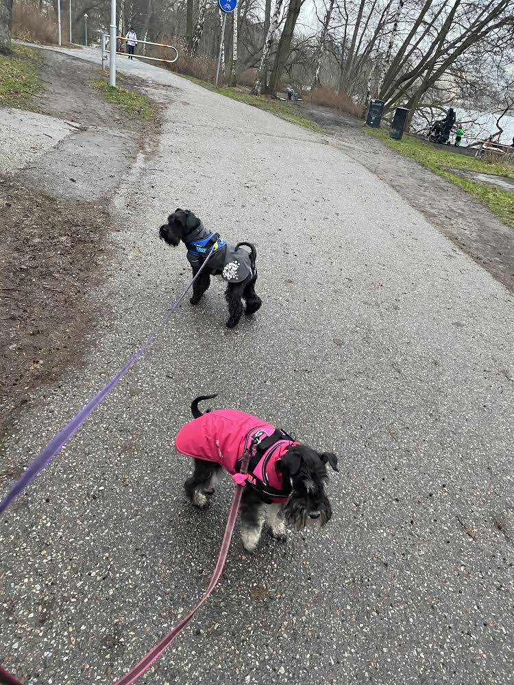 Nyårsafton. Strax innan det brakade loss så där cirka 23.45 gick vi och la oss. När det smällde som mest låg Troy och jag lugnt kvar i sängen och tittade ut genom fönstret. Lite oroligt var det nog får jag väll erkänna men husse la en hand på min rygg och sa att det är lugnt tjejen och mycket riktigt efter ett tag vart det tyst. Det blev nyårsdag och vi sov länge men det är nått på G. Vi har fått på oss skvallerdosorna dvs GPS:erna och det brukar betyda något kul. Vi åkte till Hägerstalund för att gå med på den årliga kennelträffen. Vi träffade några släktingar och många kennelsyskon med deras mattar och hussar. Cirka 15 Fixus hundar kom till träffen.