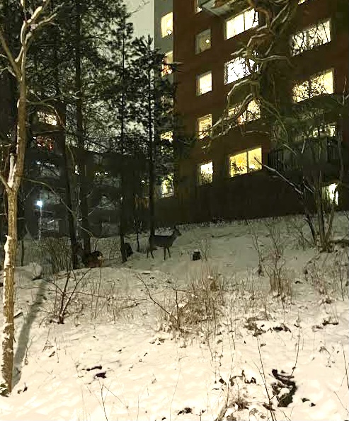 Rådjuren är inte blyga av sig. Vi får inte skälla på dem för matte och eftersom vi var tysta när vi stod och tittade på dem fick vi smaka på lite skinkost från tuben. Det är gottgottigottgott.