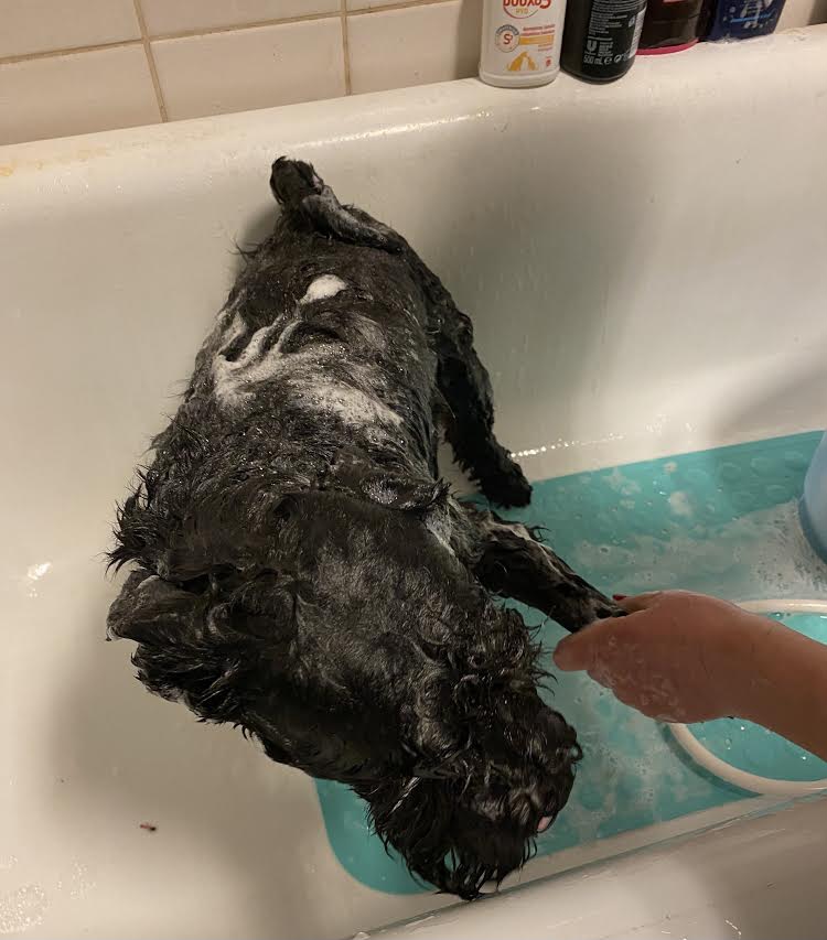 Efter middagen hade vi en liten lekstund. Matte stänger in oss på toa och gömmer sen bollen. Troy försöker öppna dörren innan matte gömt klart men det lyckas han inte med! När dörren öppnas manar matte på oss och vi letar jätteintensivt. Jag måste fräsa av Troy lite för han följer gärna efter mig för att försöka tjuva till sig bollen när jag mästersökaren Moha hittat den, det går ju inte för sig. Efter några avfräsningar letar han på egen hand och om, jag säger om, han hittar den före mig tar jag den.