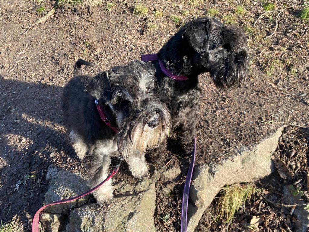 Äntligen lite sol. Då är godisstenar trevliga att hoppa upp på. Det kommer en släkting där borta som vi måste hälsa på. Vi hälsar på alla snälla hundar men att träffa en snuzze är speciellt.