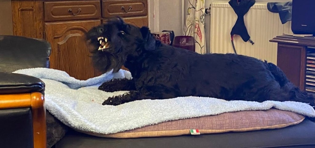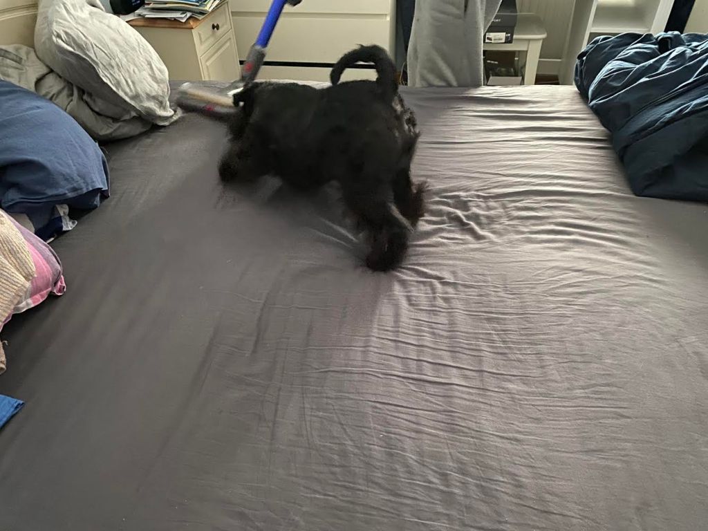 Husse dammsuger sängen för han påstår att vi grusar ned. Troy blir tokig när dammsugaren kommer fram, han attackerar munstycket. Husse ropar på matte för att få hjälp att hålla undan Troy men hon säger bara nä nä, du har tuggat till det själv genom att leka med Troy och dammsugaren. Efter mycket stök och gläfsande lyckas husse dammsuga sängen. Jag tycker den är lite läskig, fast det erkänner jag inte jag bara låtsas att den inte finns!