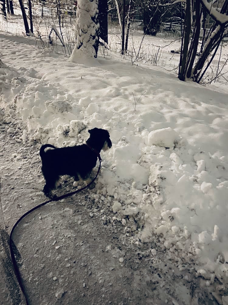 Jag gillar inte att kliva runt i hög snö. Håller mig till de plogade delarna! Ibland finns det spännande dofter på andra sidan om den jättehöga snövallen, jag tvekar men det får va!