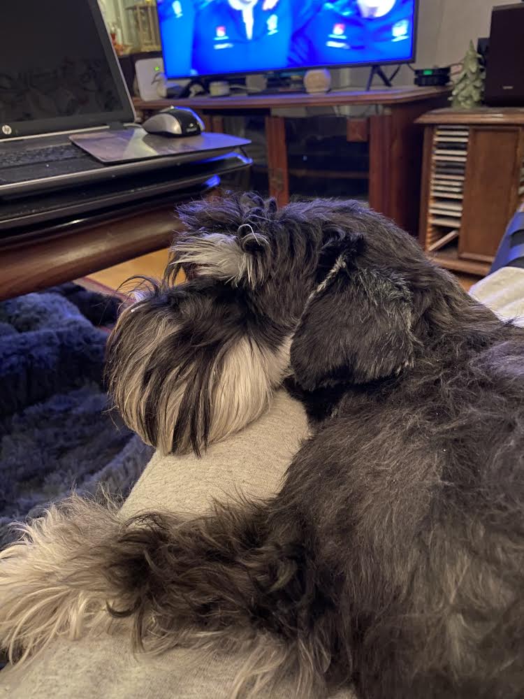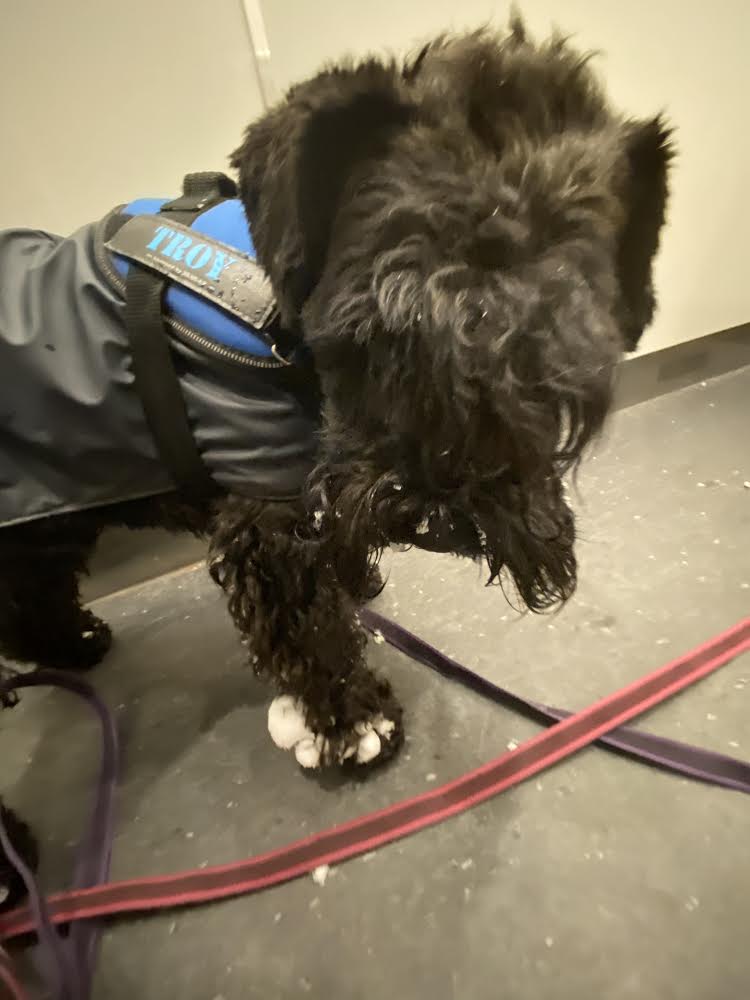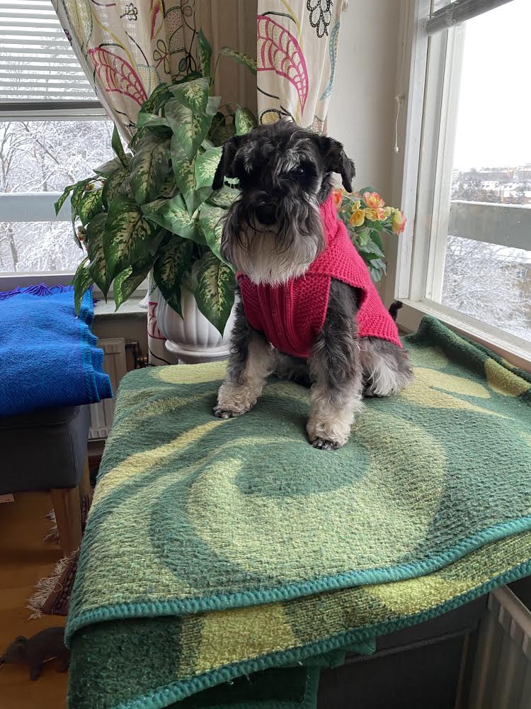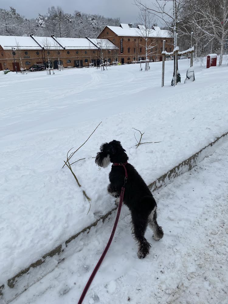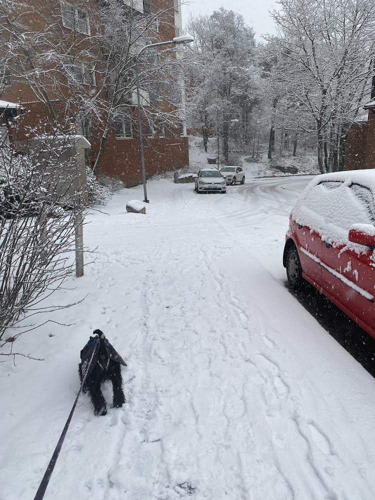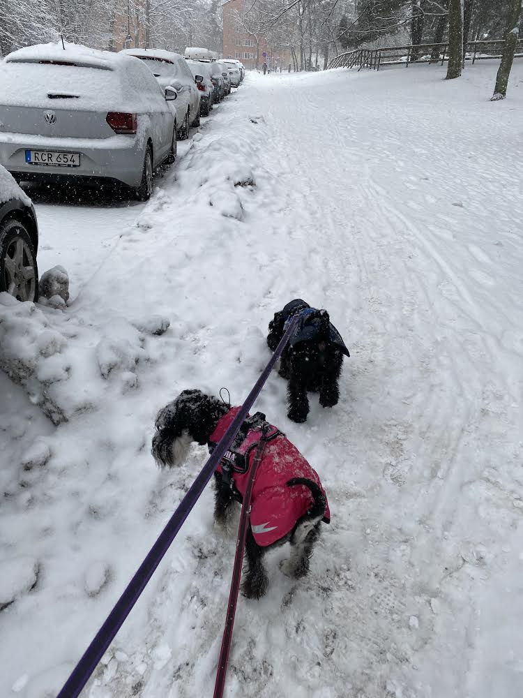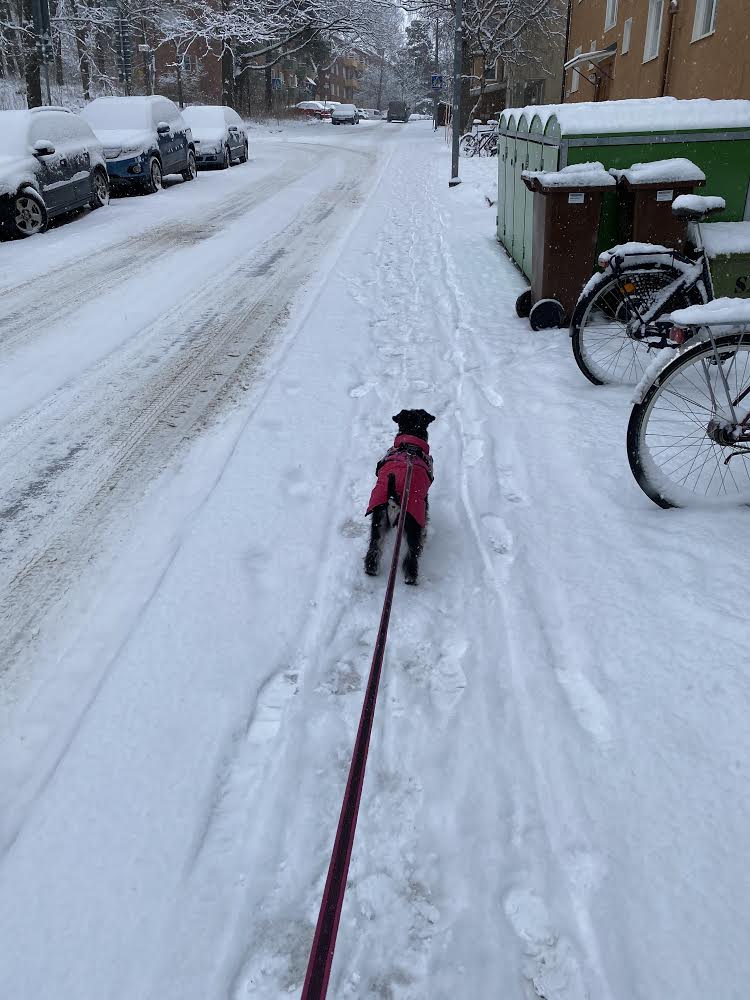 Nä… nu går vi hem tycker jag, det är inget roligt när det snöslaskar! Troy spårar efter någon av portens brudar, det finns tre st chihuahua damer i vår trappuppgång, lite till åren är de men han tycker att de är alldeles underbara! De tycker att han är en oborstad slyngel och ger honom lite stryk. Ja inte så allvarligt, mest skäll faktiskt å då börjar han fjompa sig för dem. Ni vet, han lägger sig i lekpose och hoppar runt. Men det är helt verkningslöst inte får han nosa dem i rumpan för det! Jag bryr mig icke utan går bara förbi med högt huvud, den där speciella schnauzervärdiga uppsynen. Sen får han spö av mig när vi kommit in i porten och ingen ser oss. Jag säger åt honom att lägg av med fjomperierna, du måste uppföra dig värdigt.